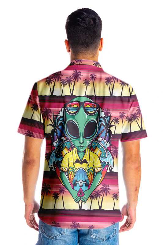 Alien With Skate Hawaiian Shirt, Palm Tree Aloha Shirt For Men, Perfect Gift For Friends, Husband, Boyfriend, Family