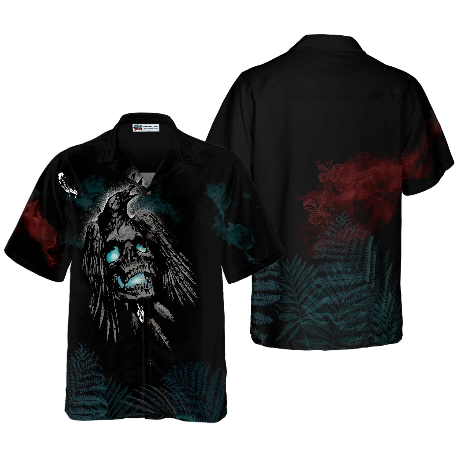 Artistic Gothic Crow Skull Goth Hawaiian Shirt, Black Aloha Shirt For Men & Women, Best Gift For Summer, Husband, Wife, Boyfriend, Girlfriend