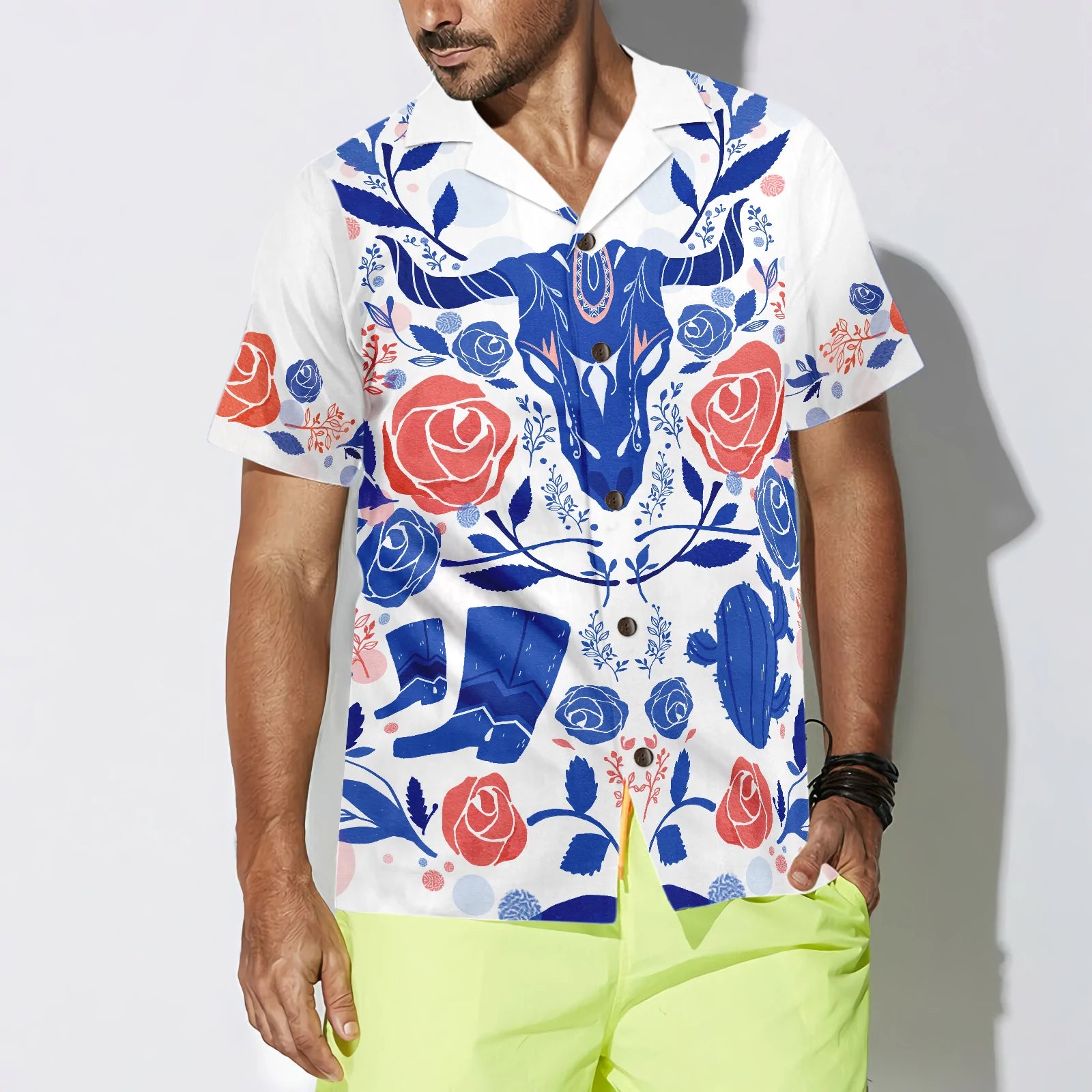 Artistic Longhorn Skull Texas Hawaiian Shirt For Men, White Blue Aloha Shirt For Texans, Texas Lovers