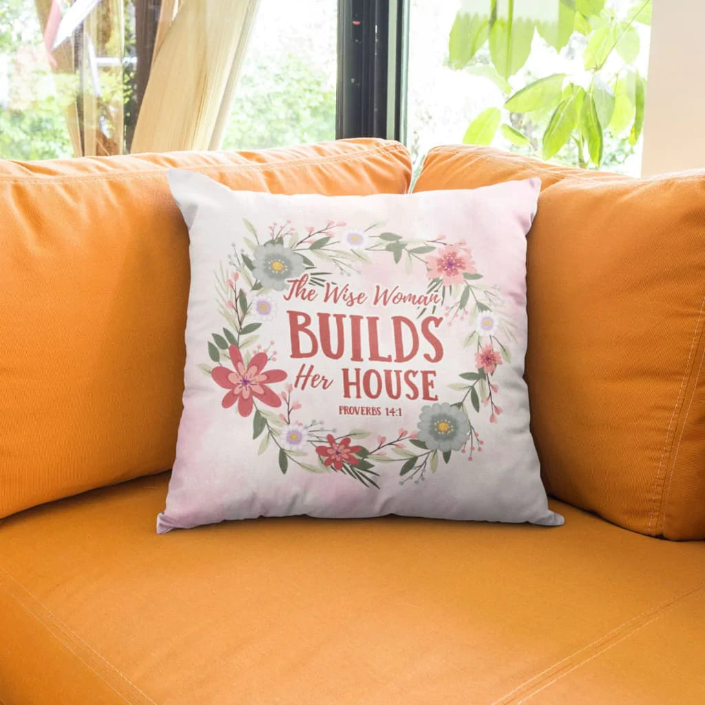 Bible Verse Pillow - Jesus Pillow - Wreath Pillow - Gift For Christian - Proverbs 14:1 The wise woman builds her house Throw Pillow