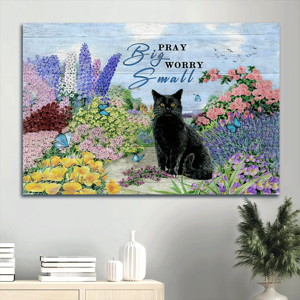 Elegance, independence, protection, magic and other vital attributes are all represented by cats. In recent years, cats have become even more important in our lives. If you are a big admirer of cat, you definitely cannot ignore this amazing Black cat Landscape Canvas- Black cat drawing, Pastel flower garden- Gift for Cat lover- Pray big, Worry small - Landscape Canvas Prints, Christian Wall Art.
