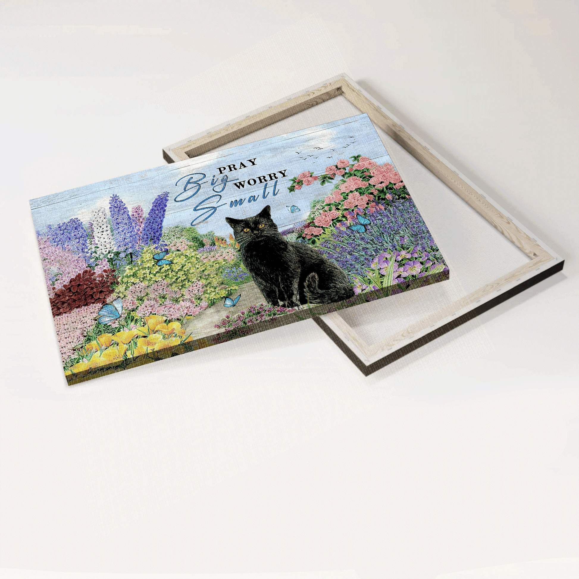 Black cat Landscape Canvas- Black cat drawing, Pastel flower garden- Gift for Cat lover- Pray big, Worry small - Landscape Canvas Prints, Christian Wall Art.