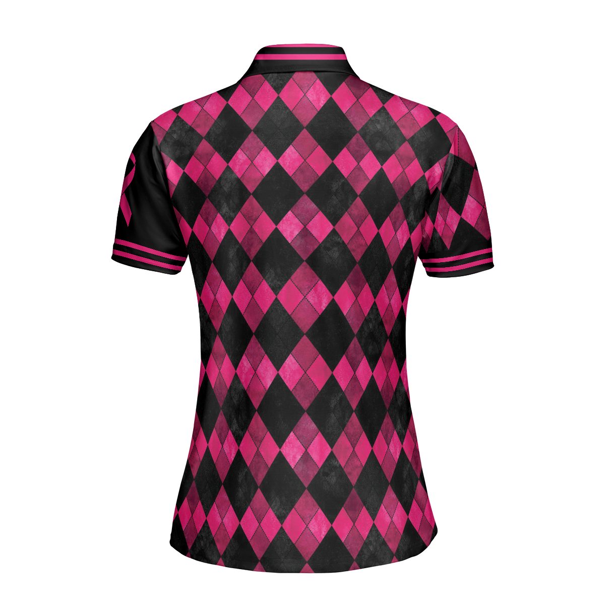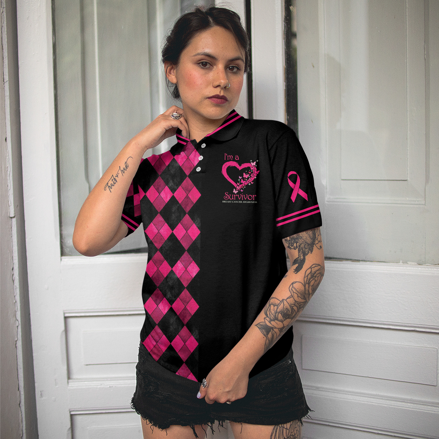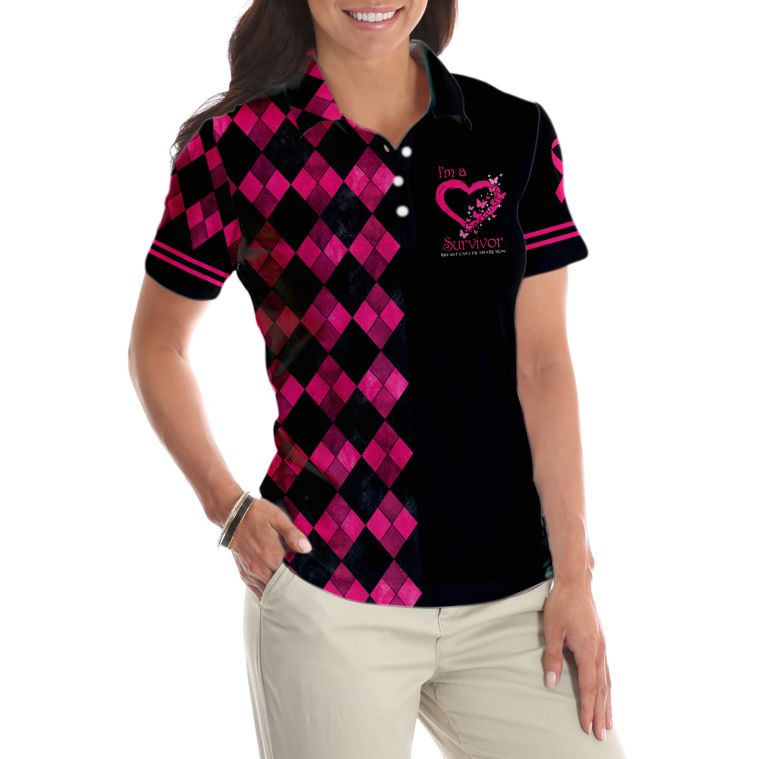 Breast Cancer Women Polo Shirt, I'm A Survivor Breast Cancer Awareness Short Sleeve Women Polo Shirt, Black And Pink Argyle Pattern Shirt