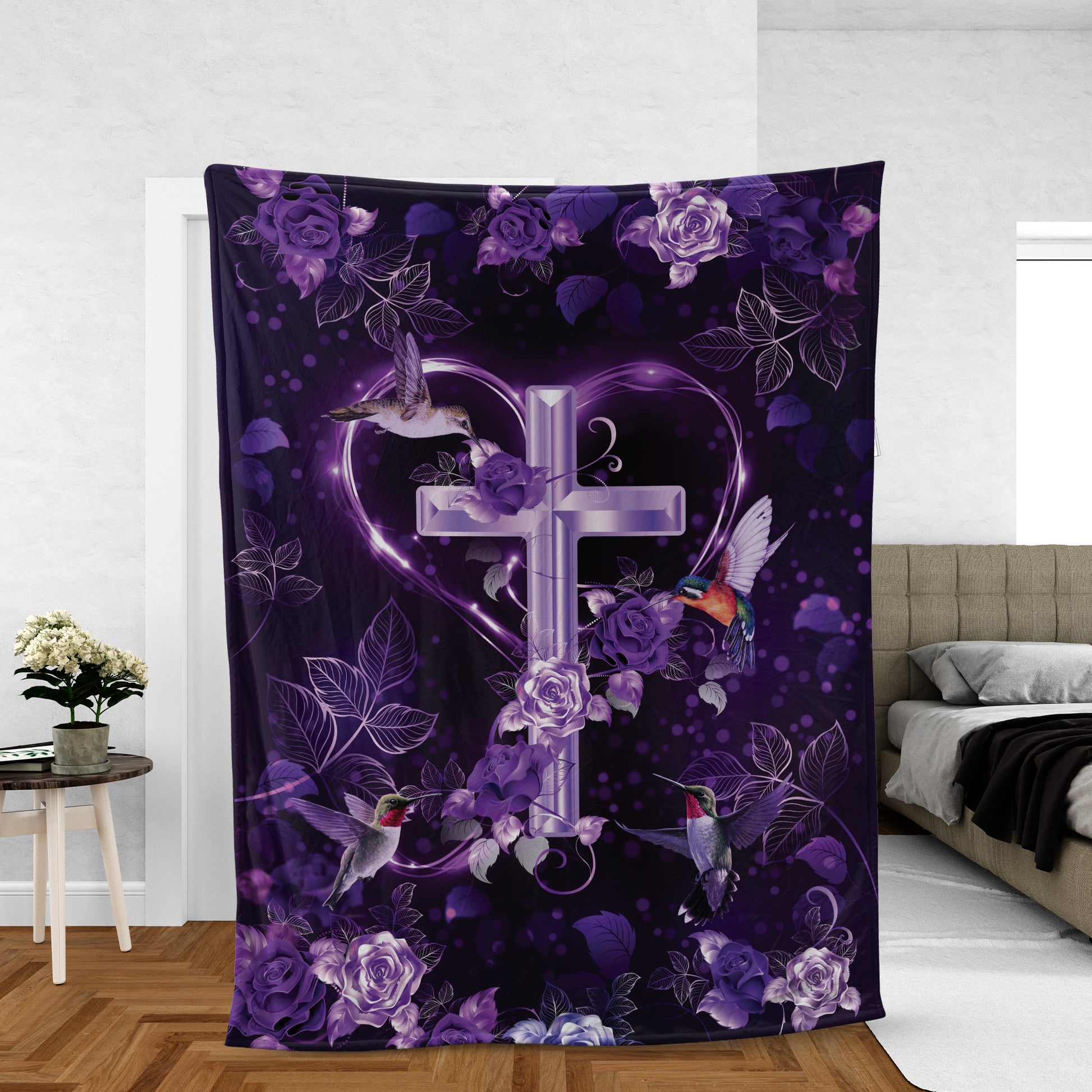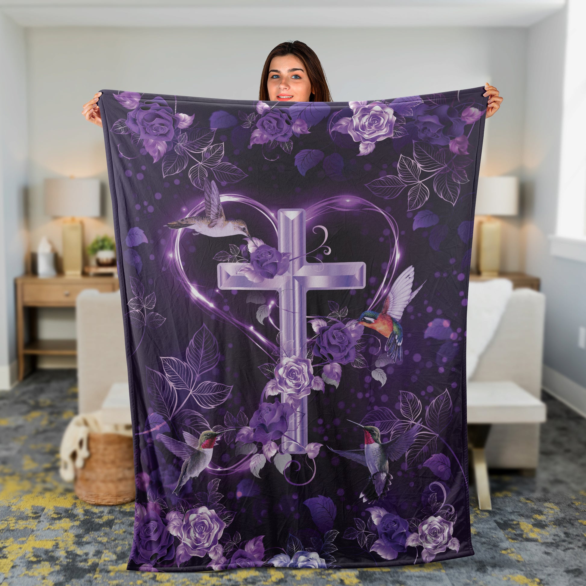 Christian Throw Blanket, Jesus Blanket, Faith Blanket, Inspirational Gift, Purple Roses Blanket, Hummingbird Blanket, The Holy Corss