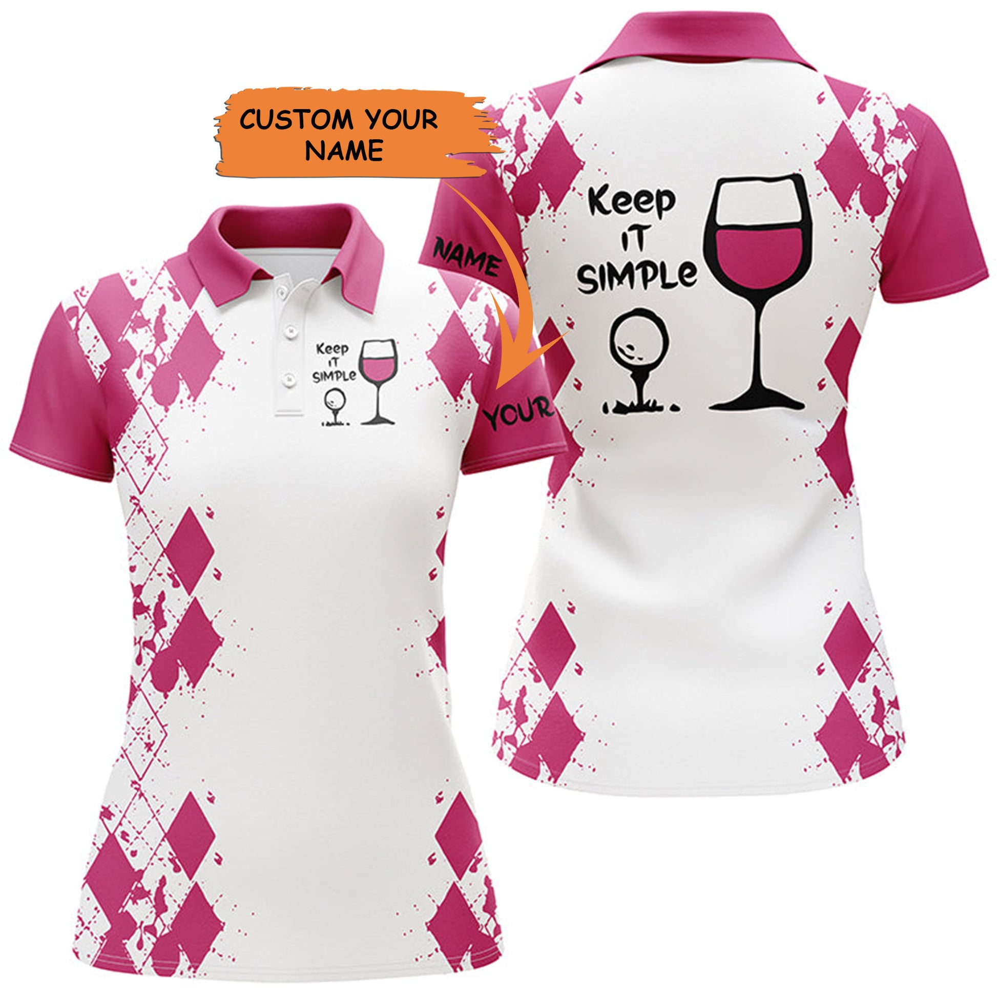 White Pink Womens Golf Shirt Keep It Simple Golf & Wine Custom Name Womens Golf Polo Shirt