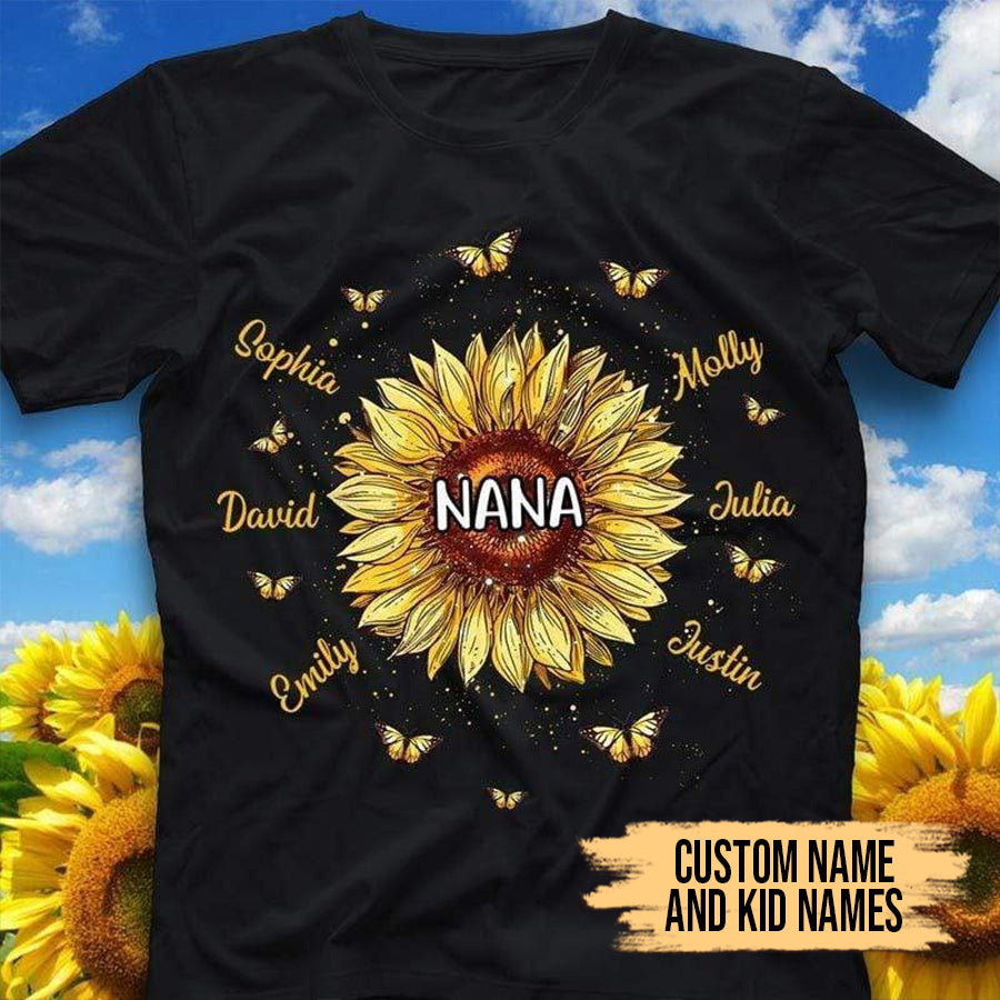 Nana and Kids Custom Name T-shirt, Sunflower Grandma Grandkids Names Personalized Shirt - Perfect Gift For Gigi, Nana, Mimi, Grandma