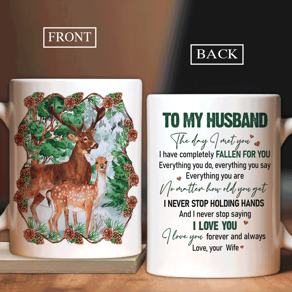 Couple White Mug- To my husband, Cute deer drawing, Green forest- Gift for Husband, couple, lover- I love you forever and always - Family White Mug.
