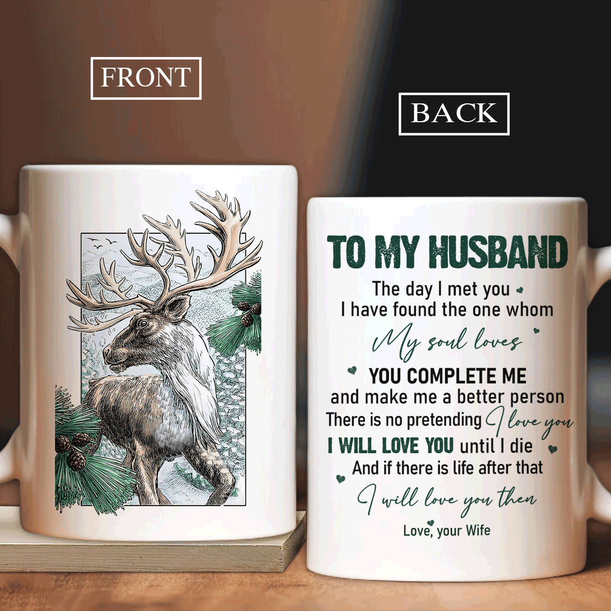 Couple White Mug- To my husband, Gray deer drawing, Pine cone- Gift for Husband, Lover, Couple- I will love you until I die - White Mug.