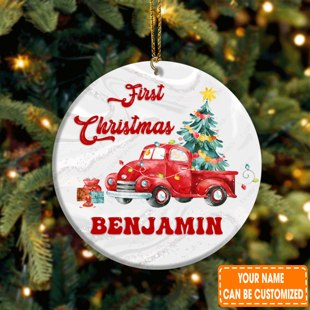 Personalized First Christmas Baby Car Pine Circle Ceramic Ornament For 1st Christmas Son, Grandson