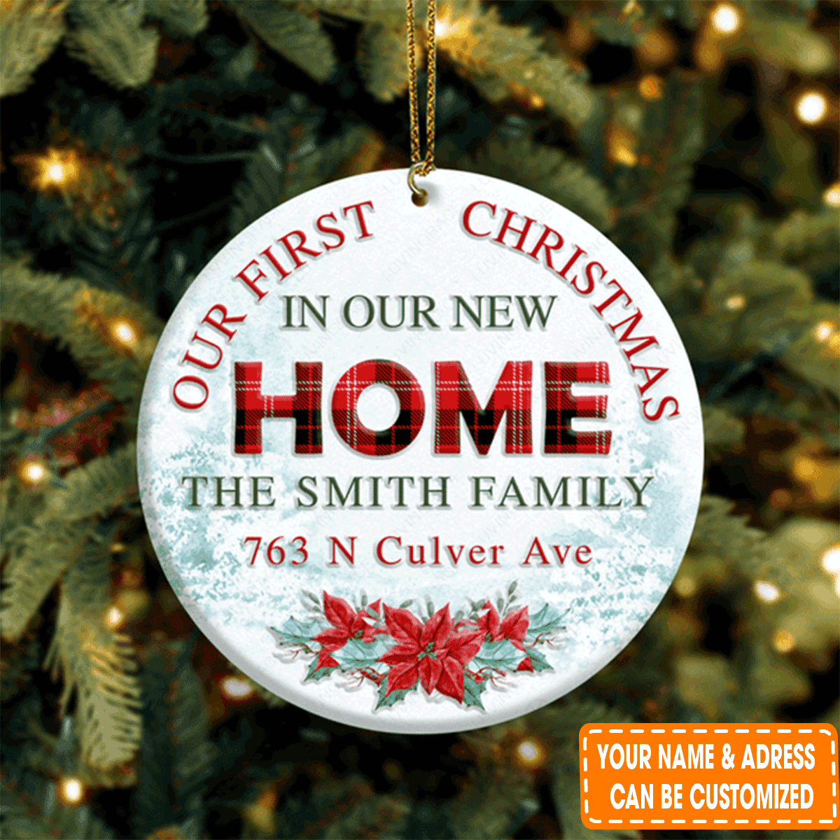 Personalized Poinsettia Snow Our First Christmas Circle Ceramic Ornament For 1st Christmas Family