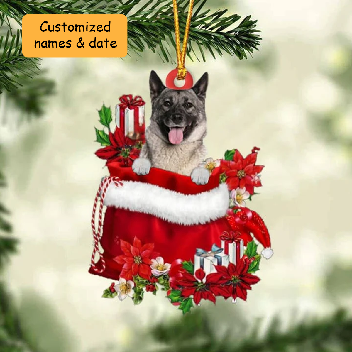 Customized Norwegian Elkhound In Red Gift Bag Acrylic Ornament, Christmas Gift For Dog Lovers, Dog Mom