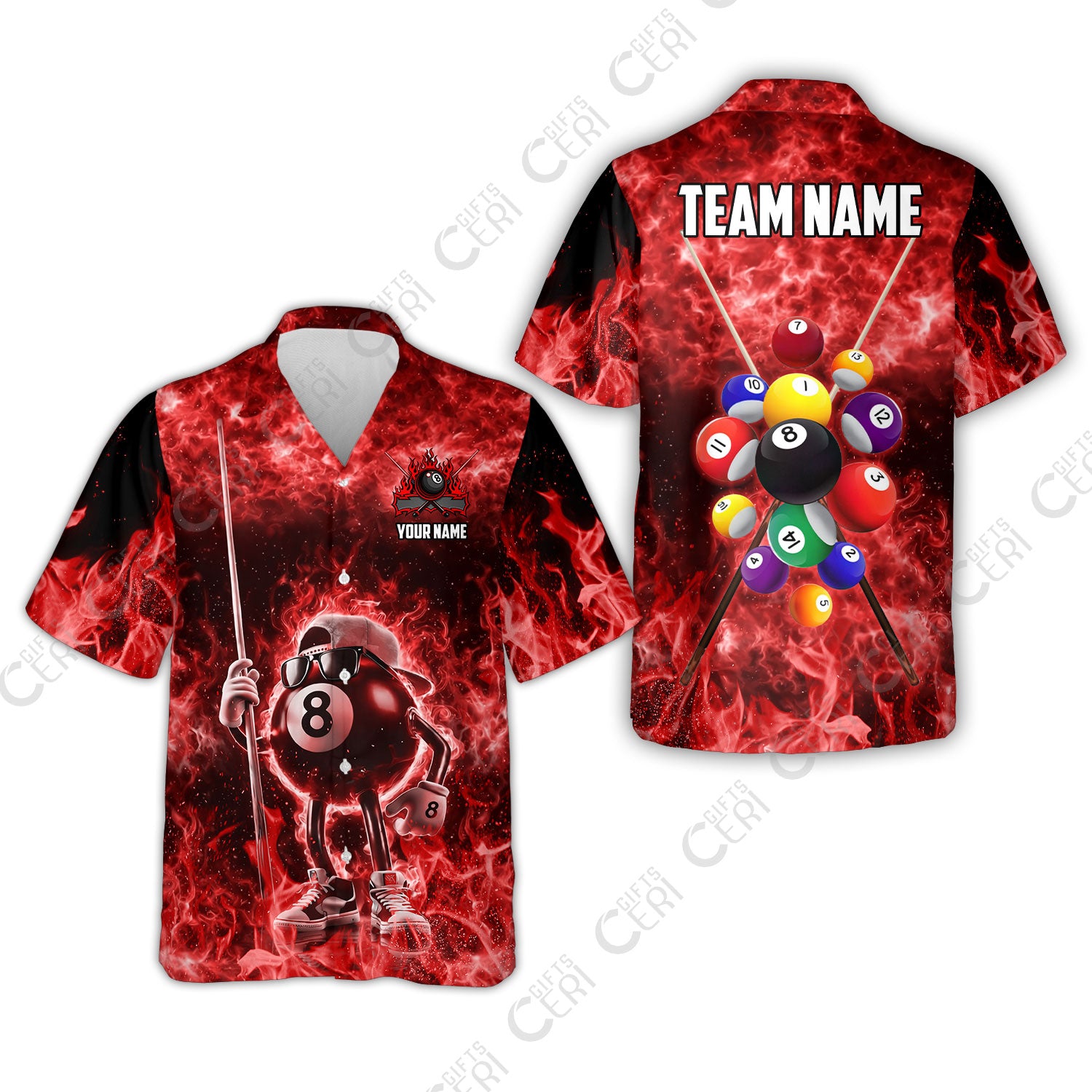 Customized 8 Ball Pool Hawaiian Shirt, 8-Ball Wearing Cap And Sunglasses Flaming Burn, Billiard Jerseys