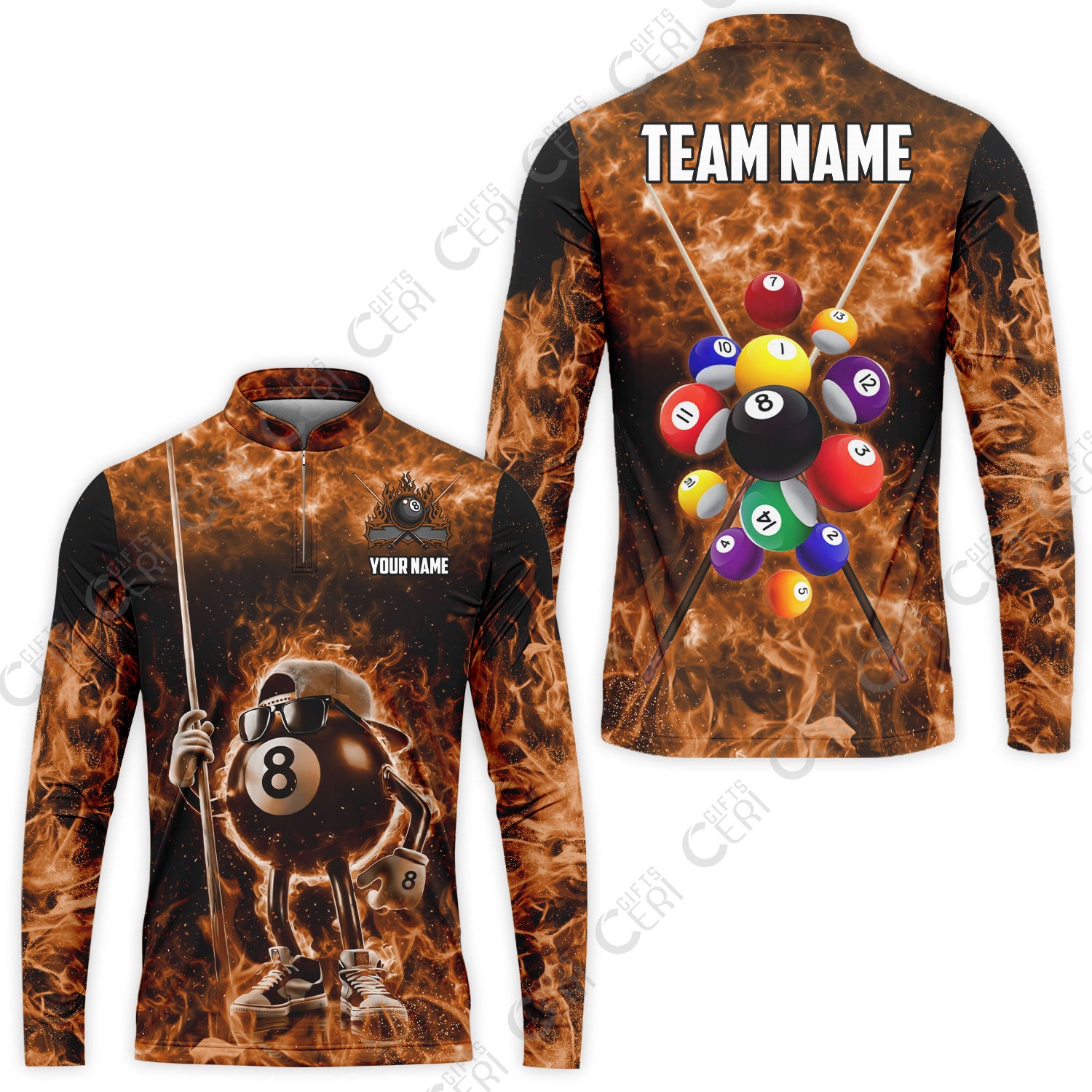 Customized 8 Ball Pool Stand Collar Quarter-Zip Long Sleeve Jersey, 8-Ball Wearing Cap And Sunglasses Flaming Burn, Billiard Jerseys