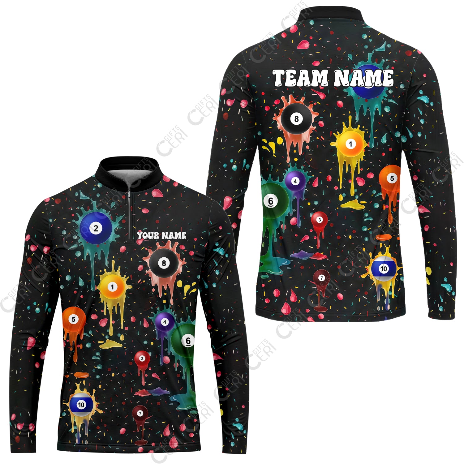 Customized 8 Ball Pool Stand Collar Quarter-Zip Long Sleeve Jersey, Billiards 8-Ball Colorful Paint-Splash, Billiards Jerseys