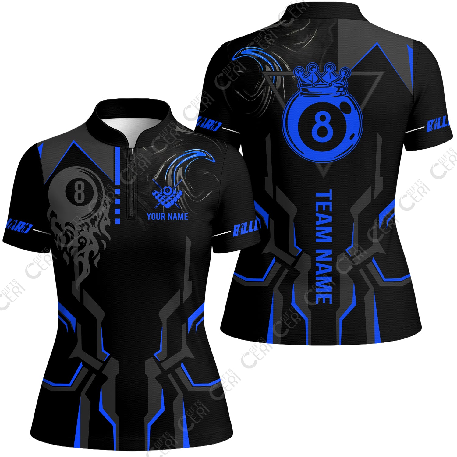 Customized 8 Ball Pool Stand Collar Quarter Zip Short Sleeve Women's Shirt, 8-Ball Liquid Effect Smoke, Billiard Jerseys