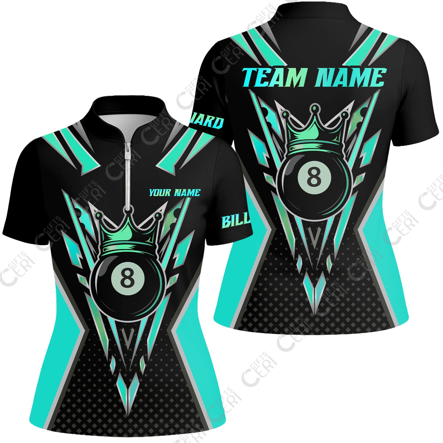 Customized 8 Ball Pool Stand Collar Quarter Zip Short Sleeve Women's Shirt, Billiard 8-Ball Crown, Billiard Jerseys