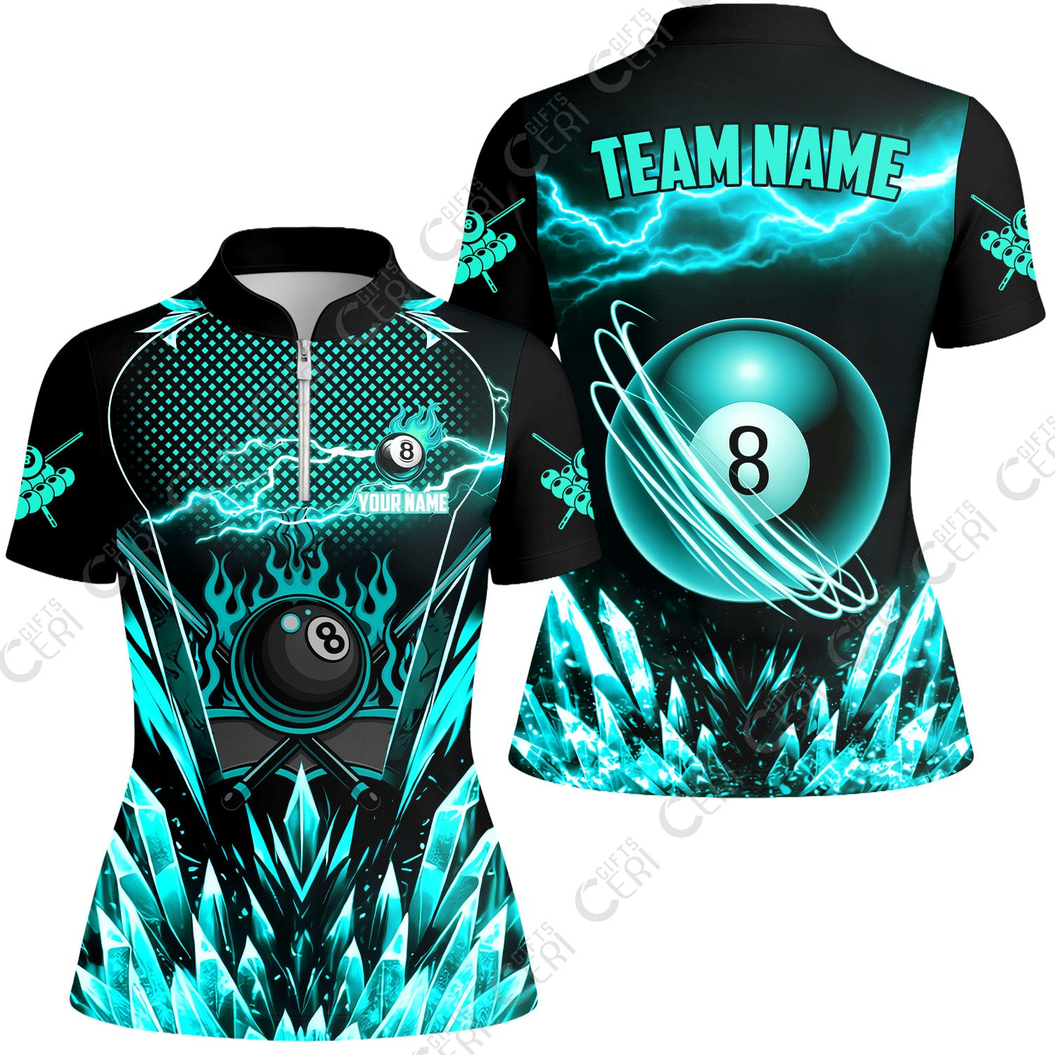 Customized 8 Ball Pool Stand Collar Quarter Zip Short Sleeve Women's Shirt, Electric Lightning Crystal, Billiards Jerseys