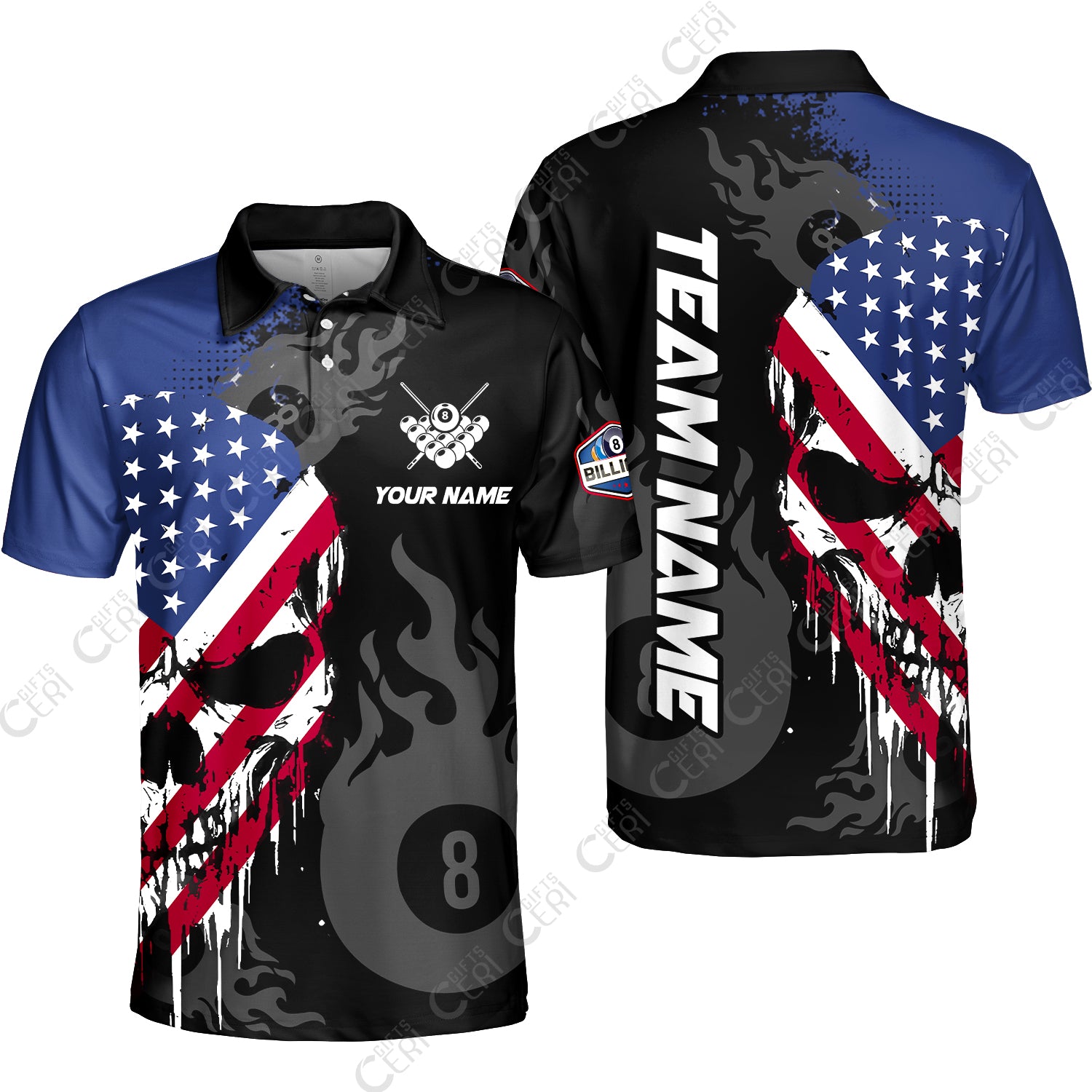 Customized 8 Ball Pool Unisex Polo Shirt, Billiards 8-Ball Flame And The Skull With American Flag, Billiards Jerseys