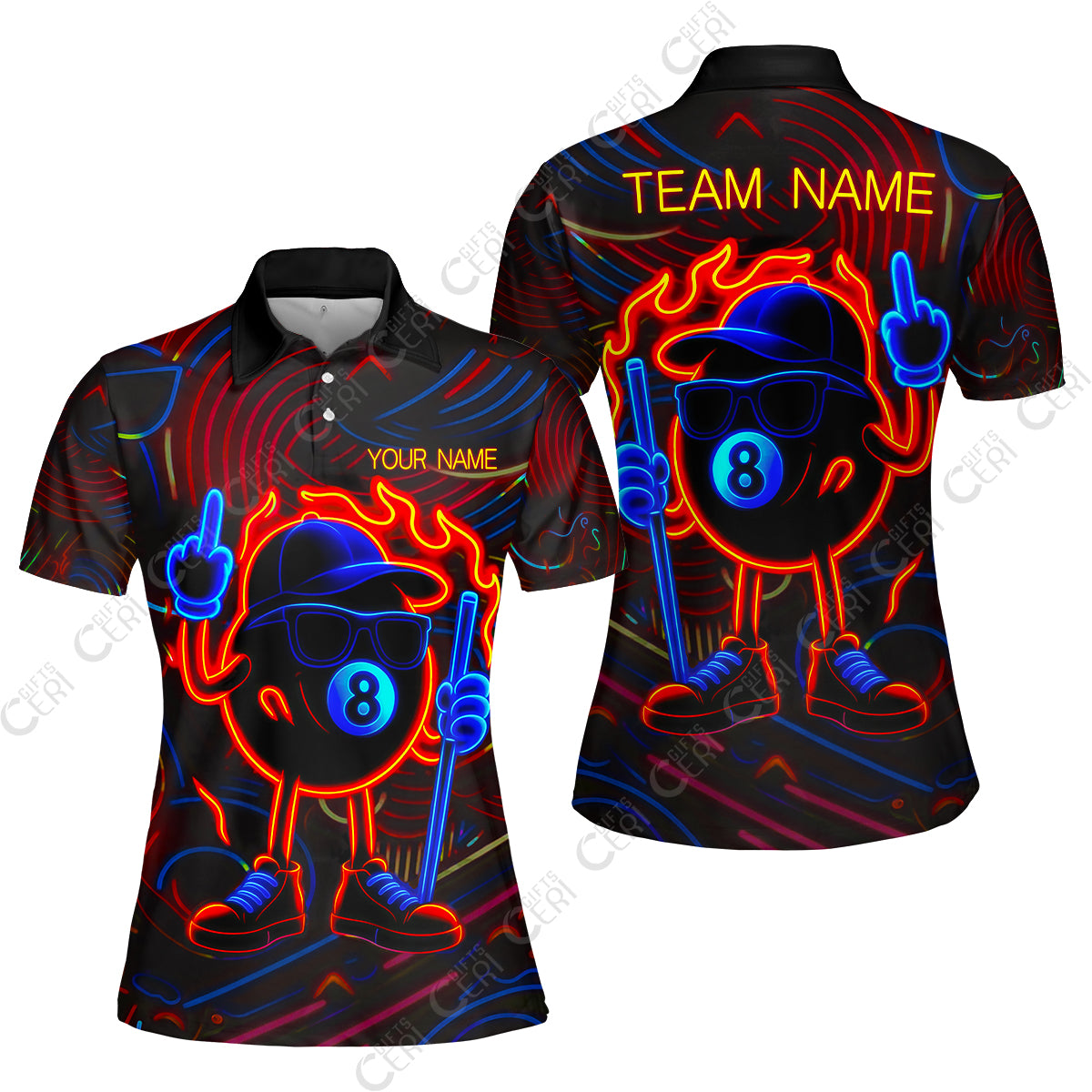 Customized 8 Ball Pool Women Polo Shirt, 8-Ball Billiard Neon Cartoon Flaming, Billiard Jerseys