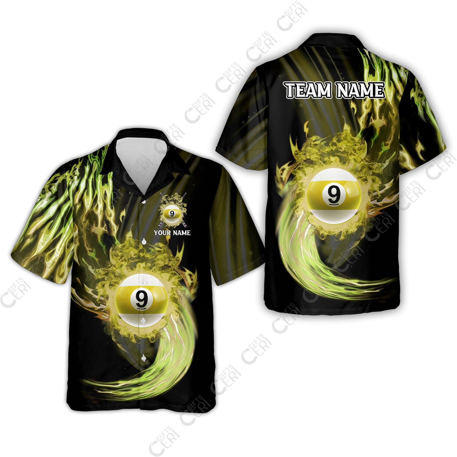 Customized 9 Ball Pool Hawaiian Shirt, 9-Ball Swirling Fire And Glowing Smoke, Billiards Jerseys