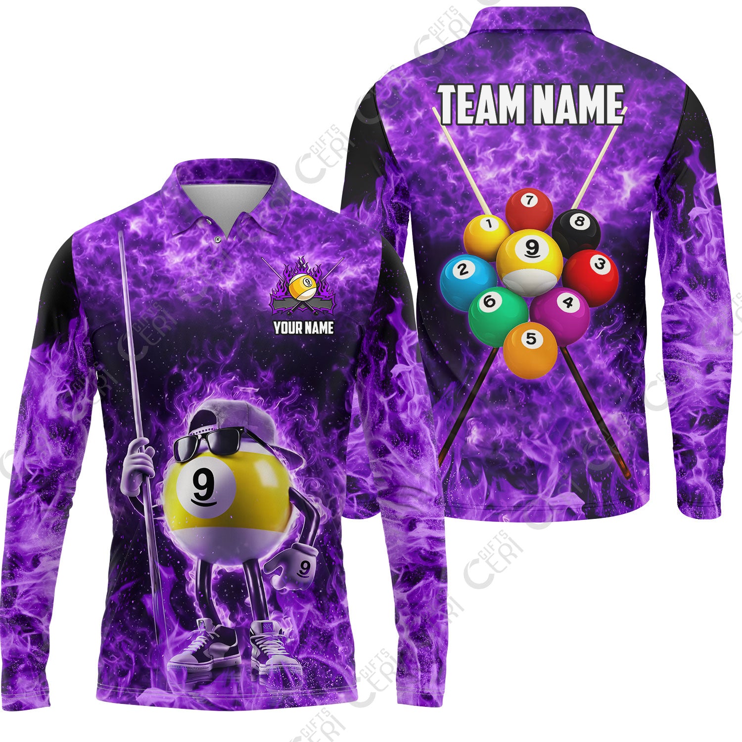 Customized 9 Ball Pool Long Sleeve Polo Shirt, 9-Ball Wearing Cap And Sunglasses Flaming Burn, Billiard Jerseys