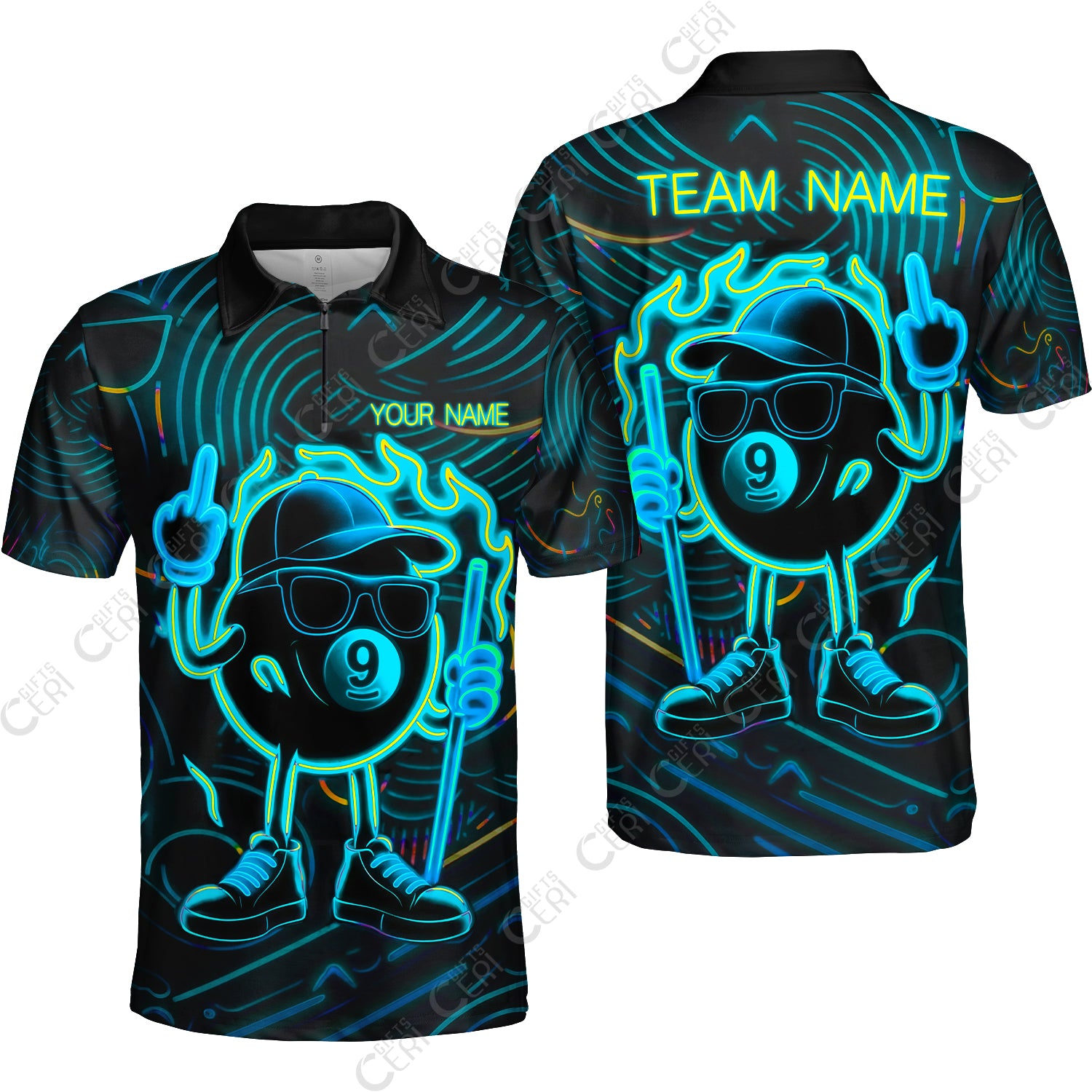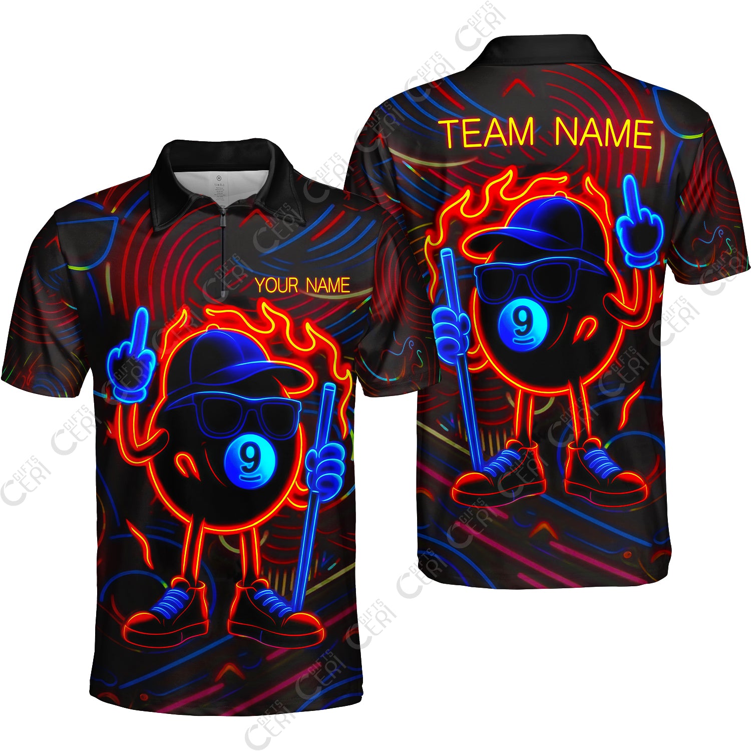 Customized 9 Ball Pool Quarter-Zip Polo Shirt, 9-Ball Billiard Neon Cartoon Flaming, Billiard Jerseys