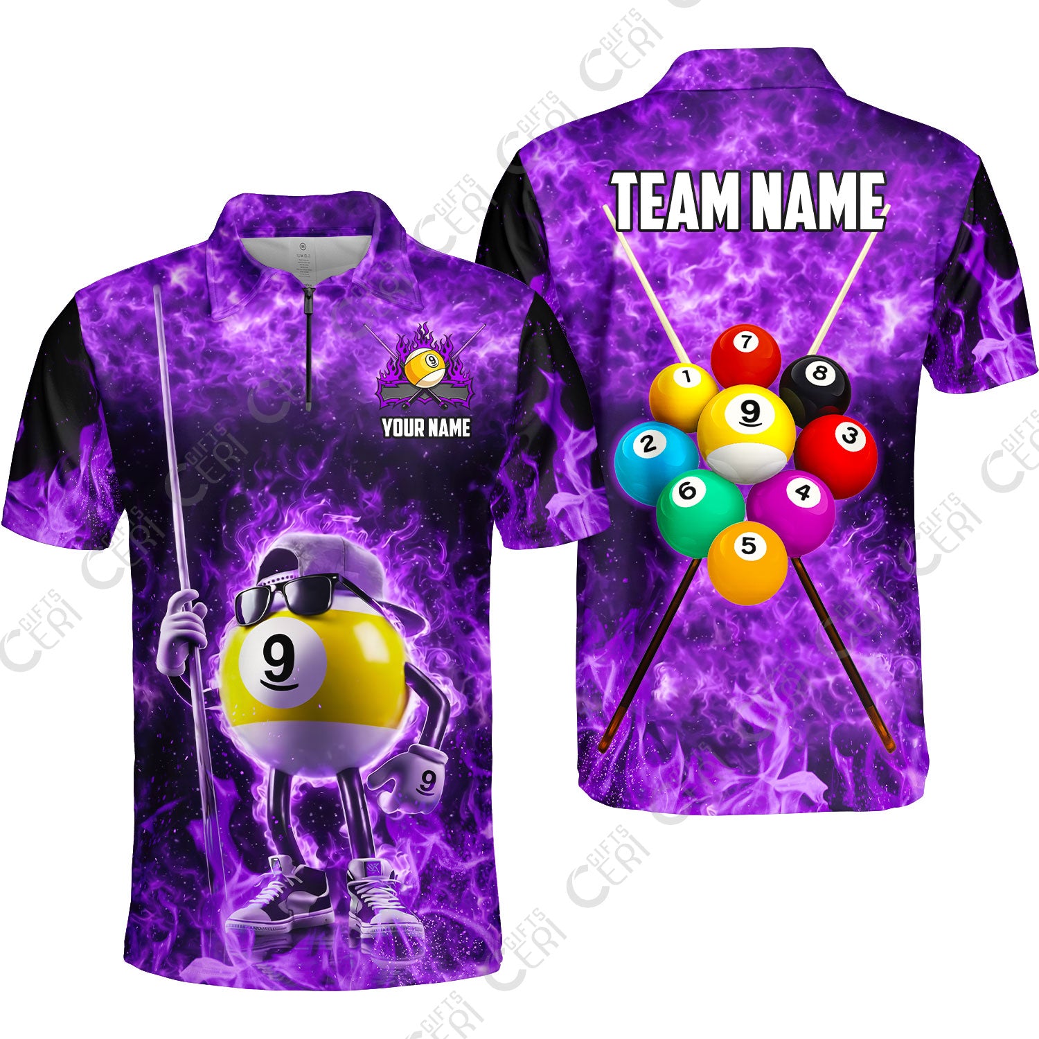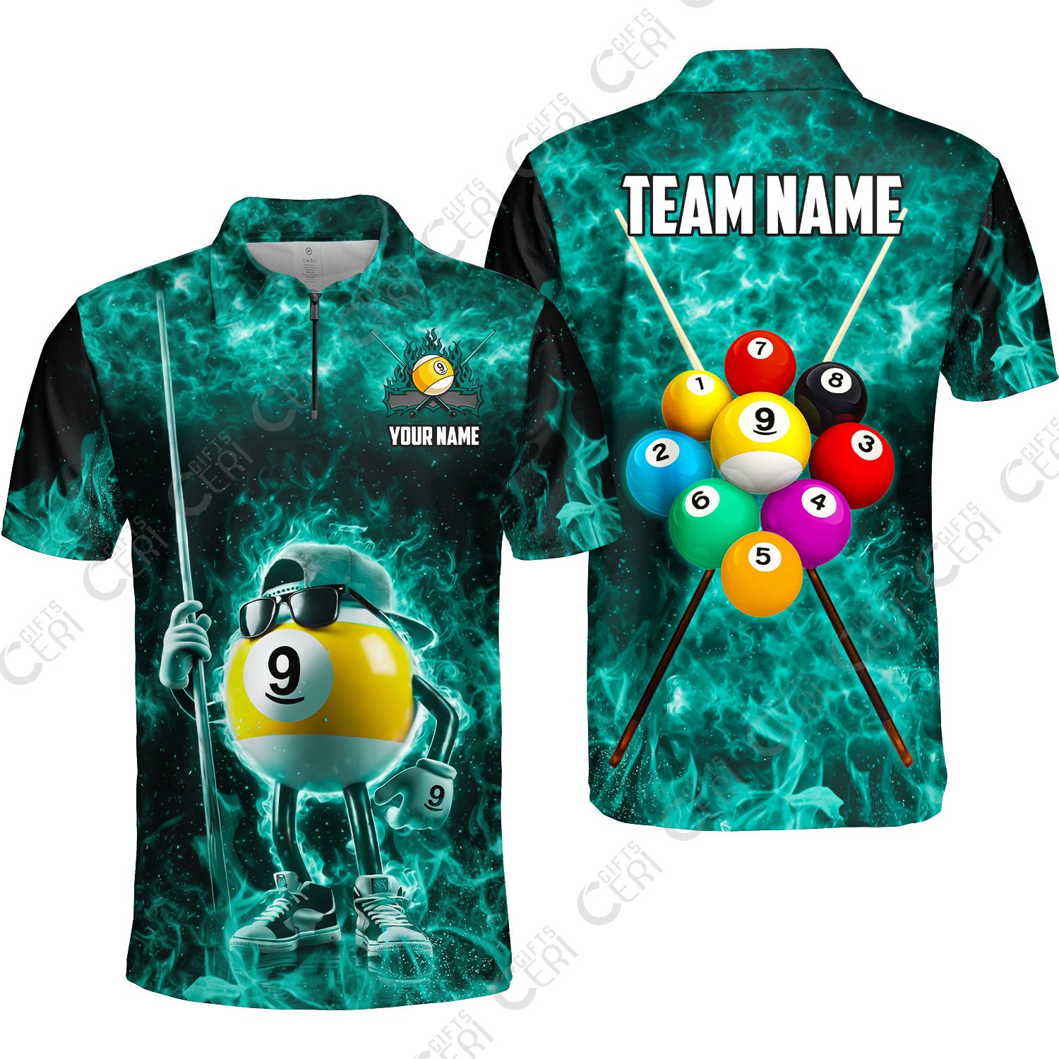 Customized 9 Ball Pool Quarter-Zip Polo Shirt, 9-Ball Wearing Cap And Sunglasses Flaming Burn, Billiard Jerseys