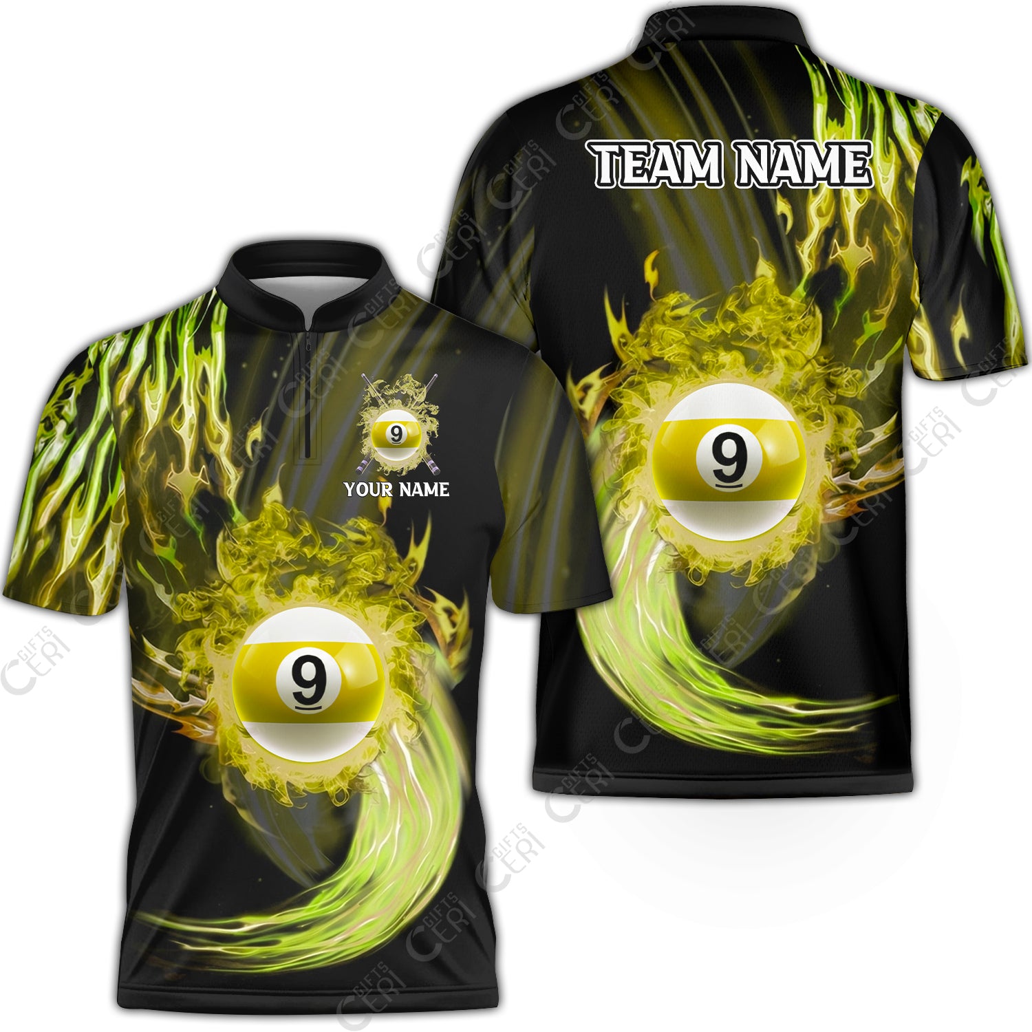 Customized 9 Ball Pool Stand Collar Quarter-Zip Short Sleeve Jersey,9-Ball Swirling Fire And Glowing Smoke, Billiards Jerseys