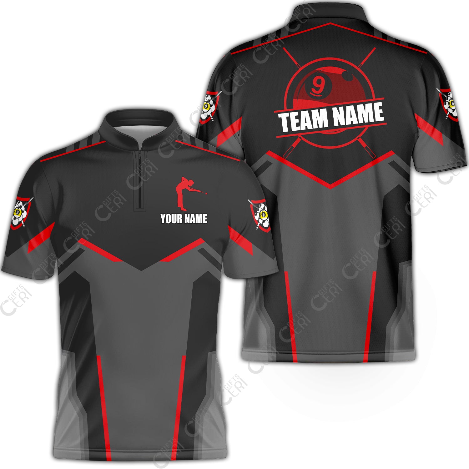 Customized 9 Ball Pool Stand Collar Quarter-Zip Short Sleeve Jersey, Billiards Man Vector 9-Ball, Billiards Jerseys