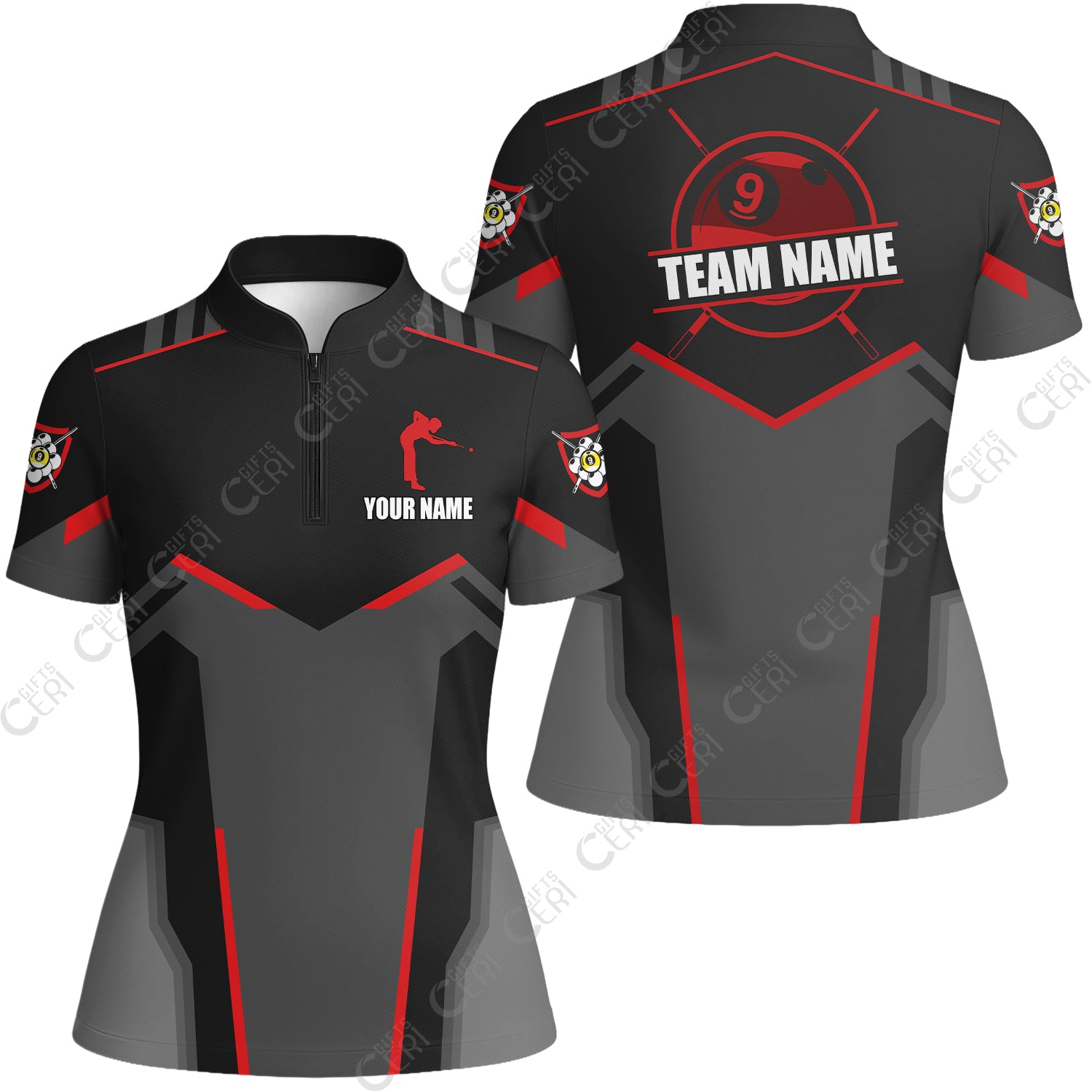 Customized 9 Ball Pool Stand Collar Quarter-Zip Short Sleeve Women's Shirt, Billiards Man Vector 9-Ball, Billiards Jerseys