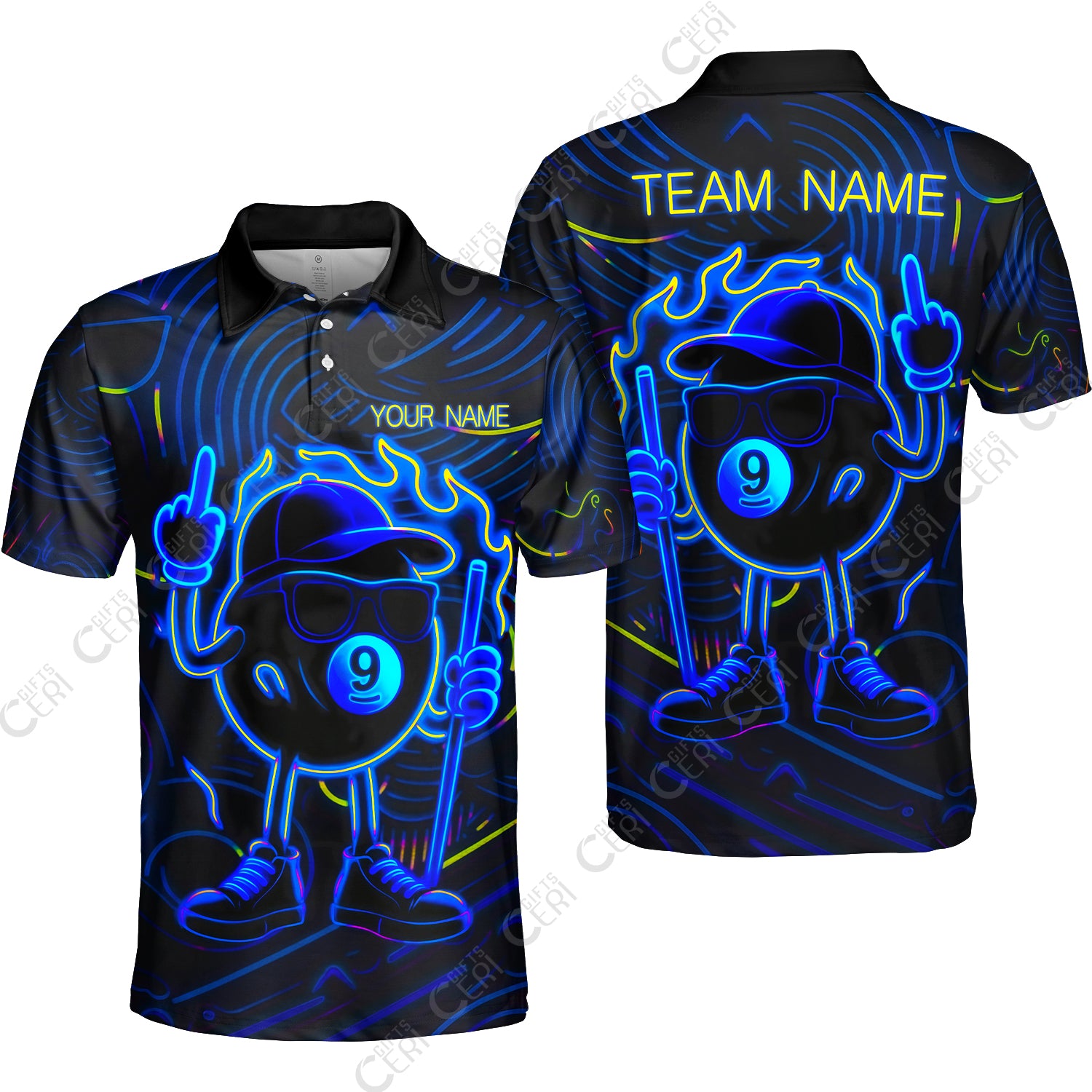 Customized 9 Ball Pool Unisex Polo Shirt, 9-Ball Billiard Neon Cartoon Flaming, Billiard Jerseys