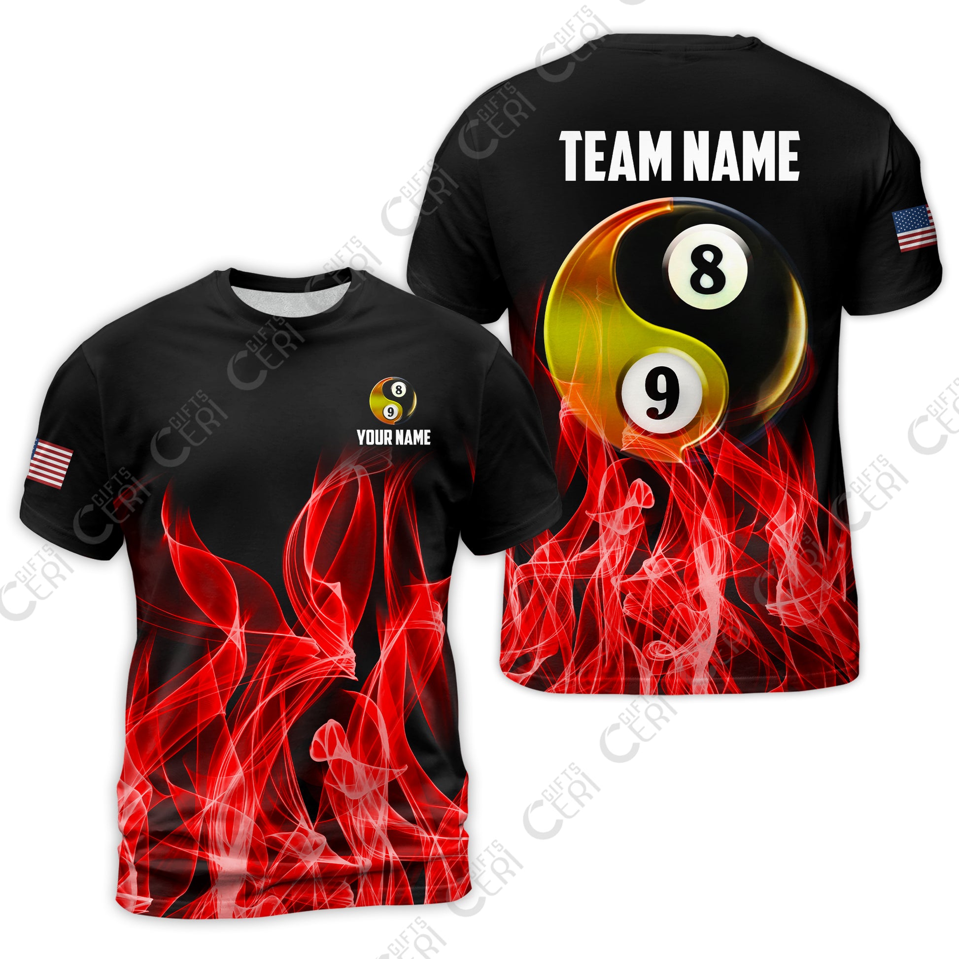 Customized Billiard T-Shirt, Billiard 8-Ball And 9-Ball Yin-Yang Flame, Billiard Jerseys
