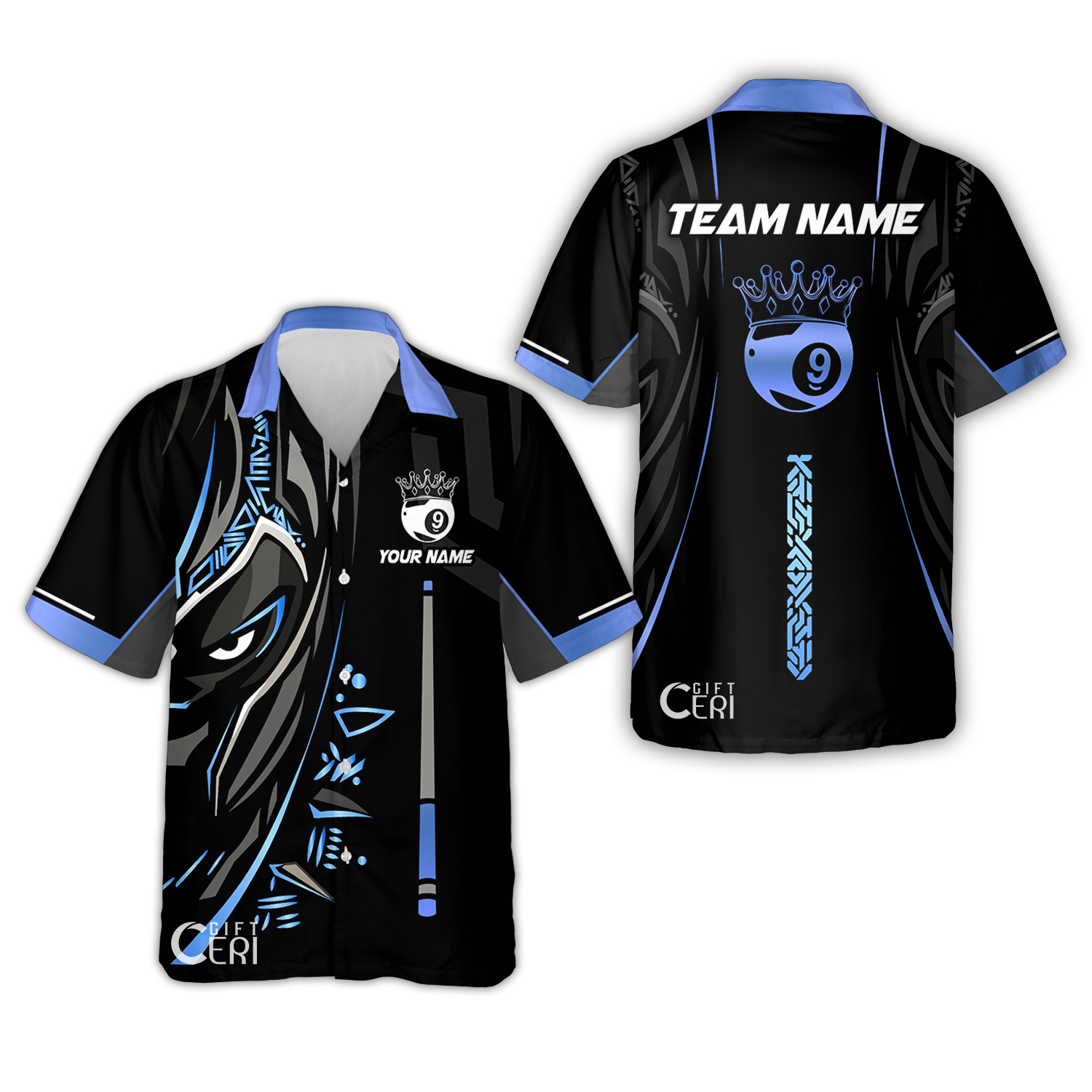 Customized Billiards Hawaiian Shirt, Black Panther With Snooker Cue and Crown 9 Ball Pool Jersey