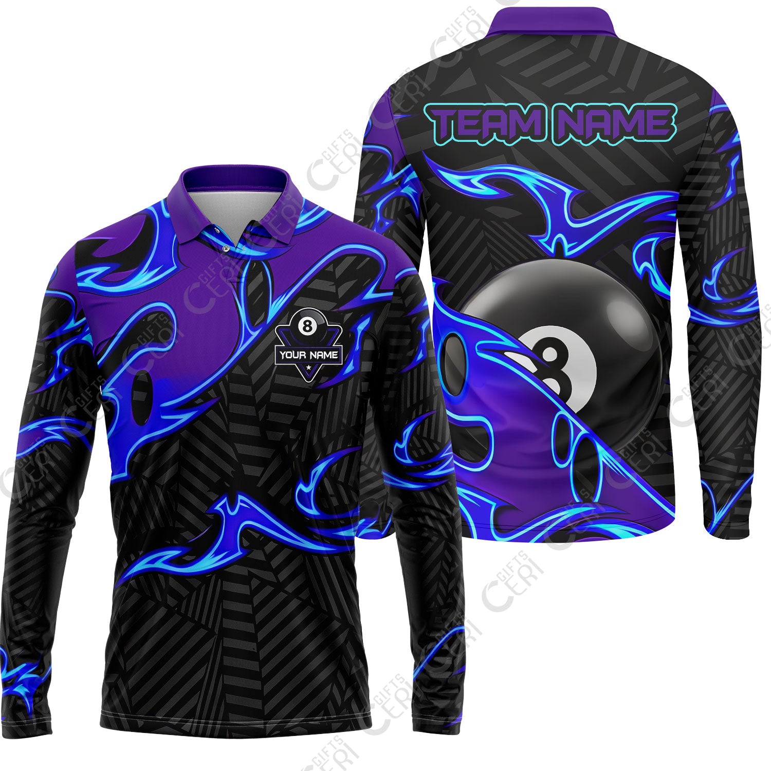 Customized Billiards Long Sleeve Polo Shirt, Blue Fire 8 Ball Jersey