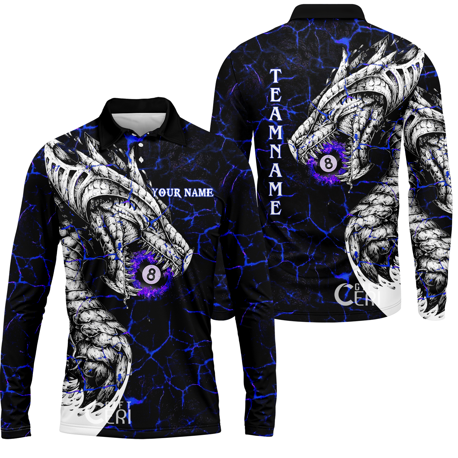 Customized Billiards Long Sleeve Polo Shirt, Magma Pattern And Dragon 8 Ball Jersey
