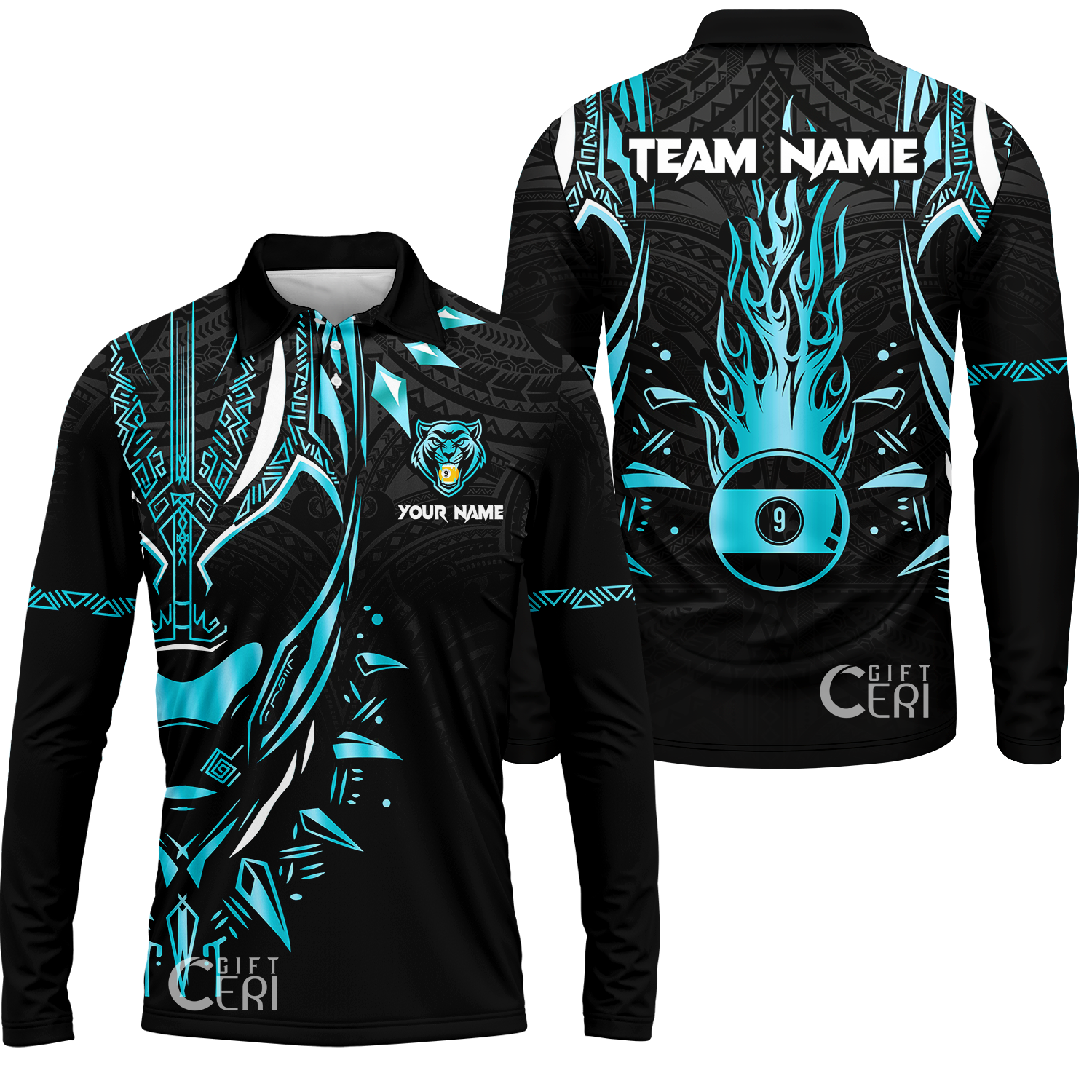 Customized Billiards Long Sleeve Polo Shirt, Panther Forever Flaming 9 Ball Personalized Jersey Gift For Billiard Players