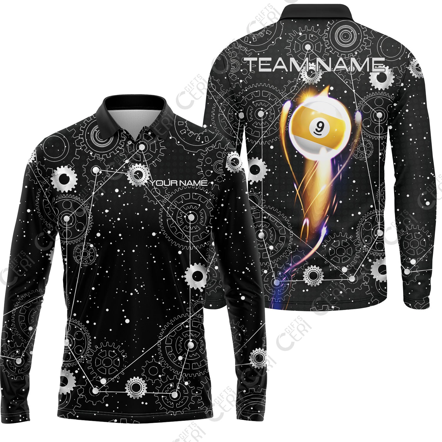 Customized Billiards Long Sleeve Polo Shirt, Personalized 9 Ball Lighting Gear Pattern Jersey Gift For Billiard Players
