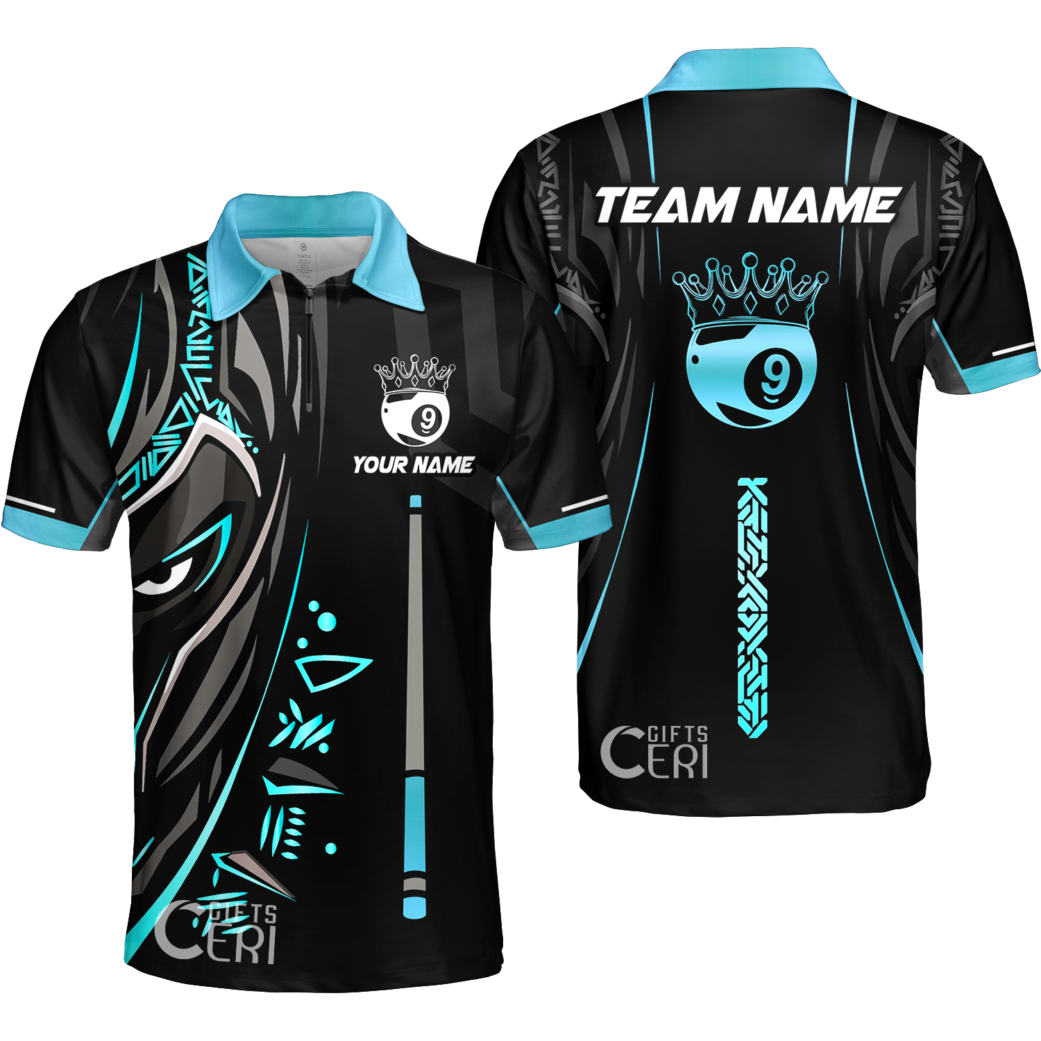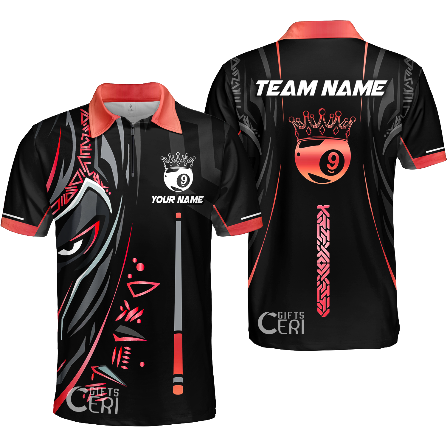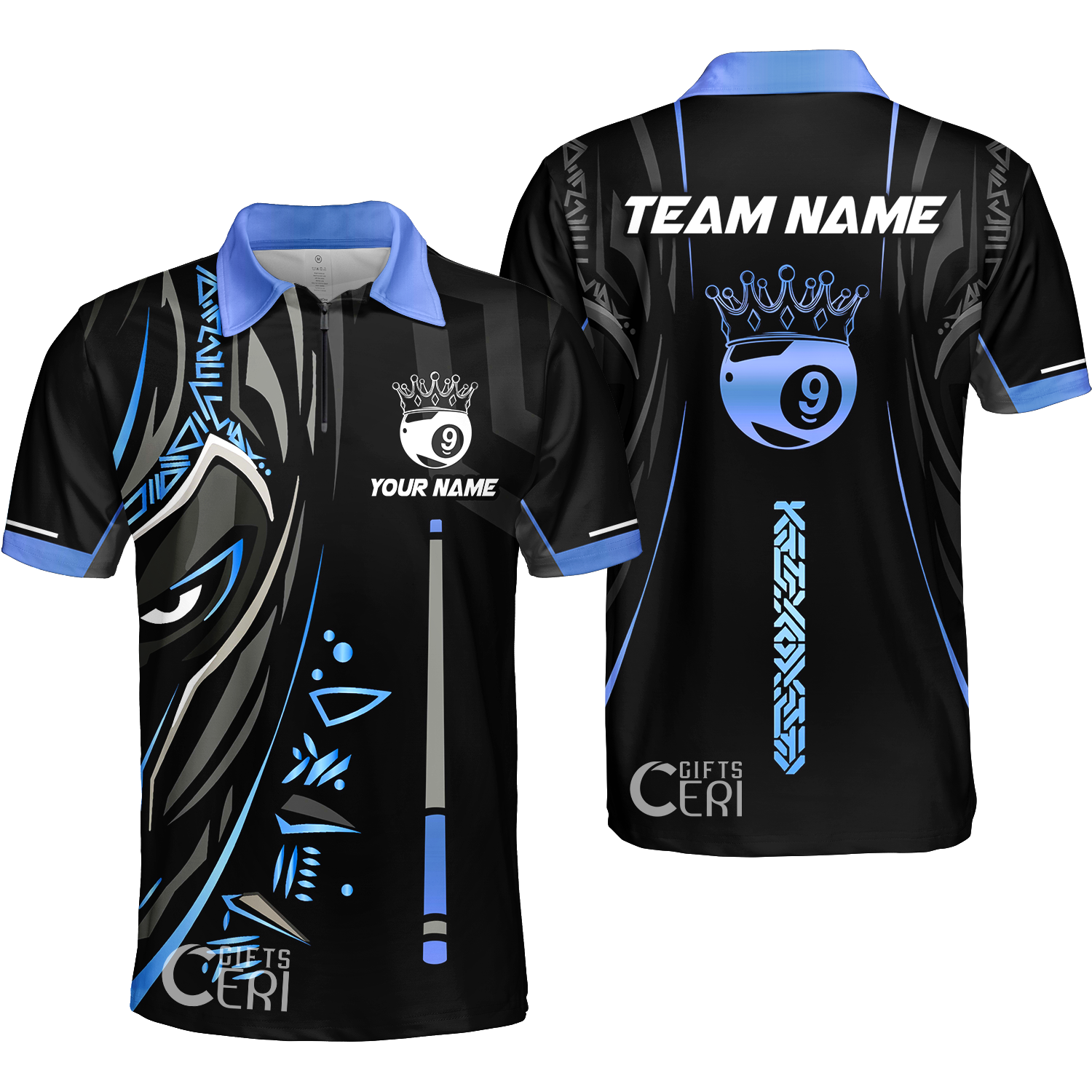 Customized Billiards Quarter-Zip Polo Shirt, Black Panther With Snooker Cue and Crown 9 Ball Pool Jersey