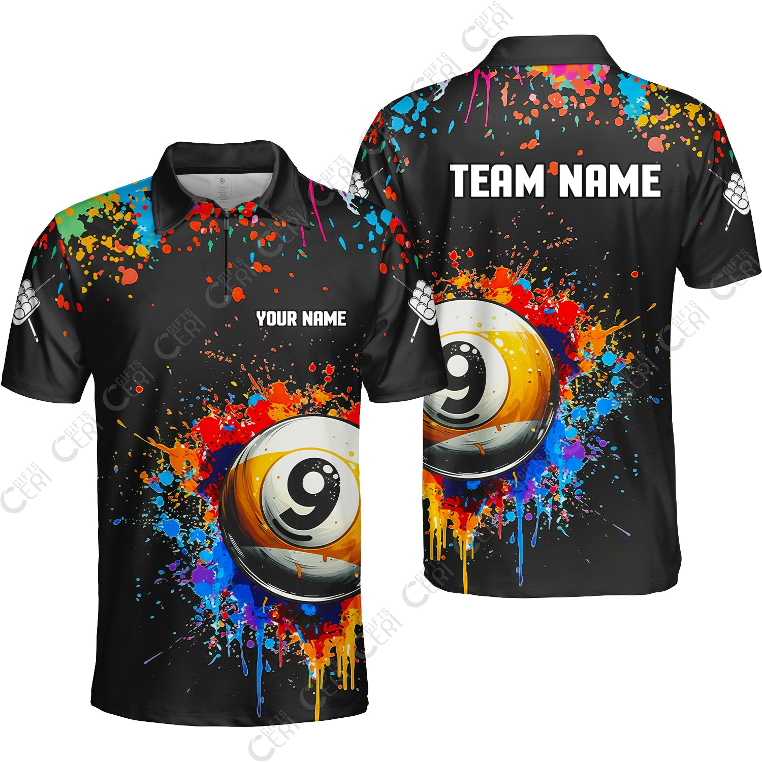 Customized Billiards Quarter-Zip Polo Shirt, Colorful Painting Splatter 9 Ball Personalized Jersey Gift For Billiard Players