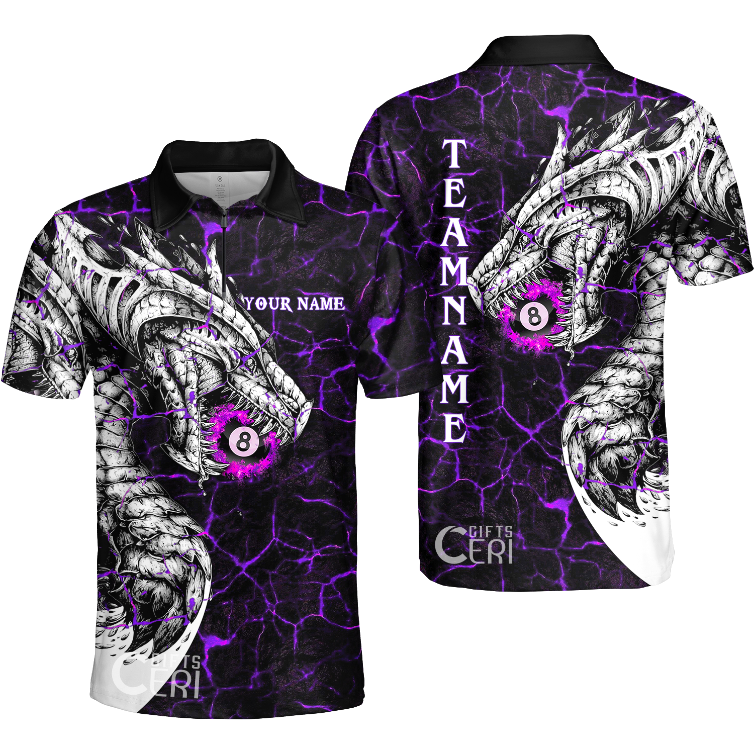 Customized Billiards Quarter-Zip Polo Shirt, Magma Pattern And Dragon 8 Ball Jersey