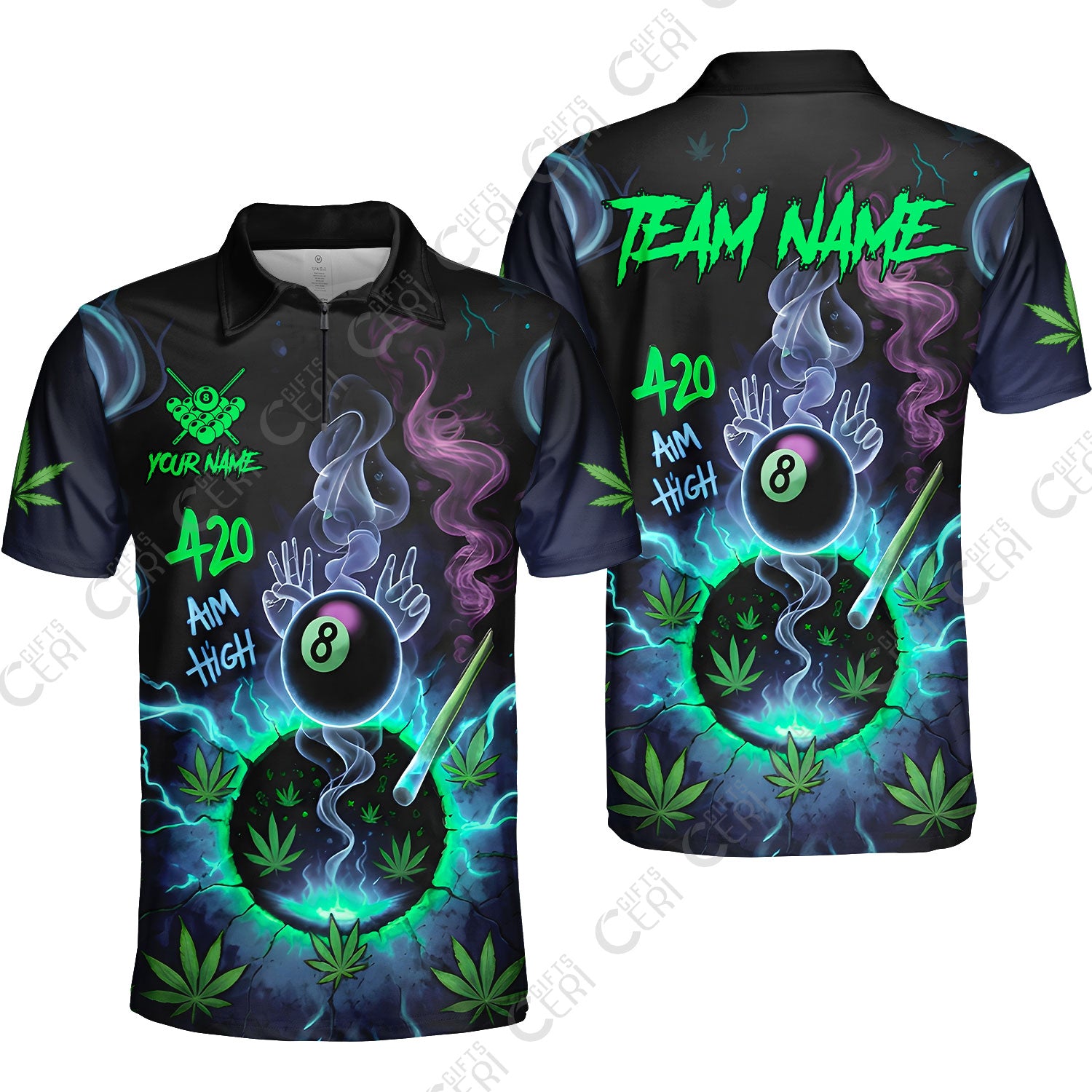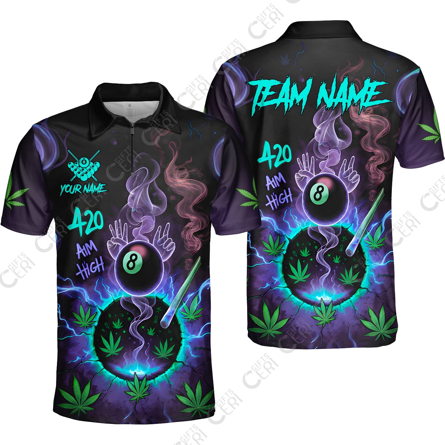 Customized Billiards Quarter-Zip Polo Shirt, Personalized 420 Aim High 8 Ball Pool Team Jersey Gift For Billiard Players