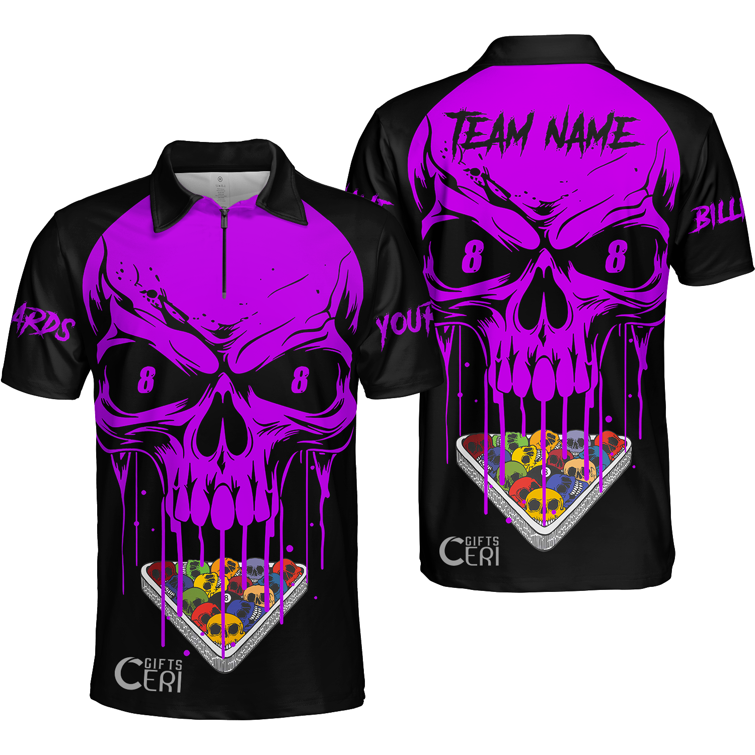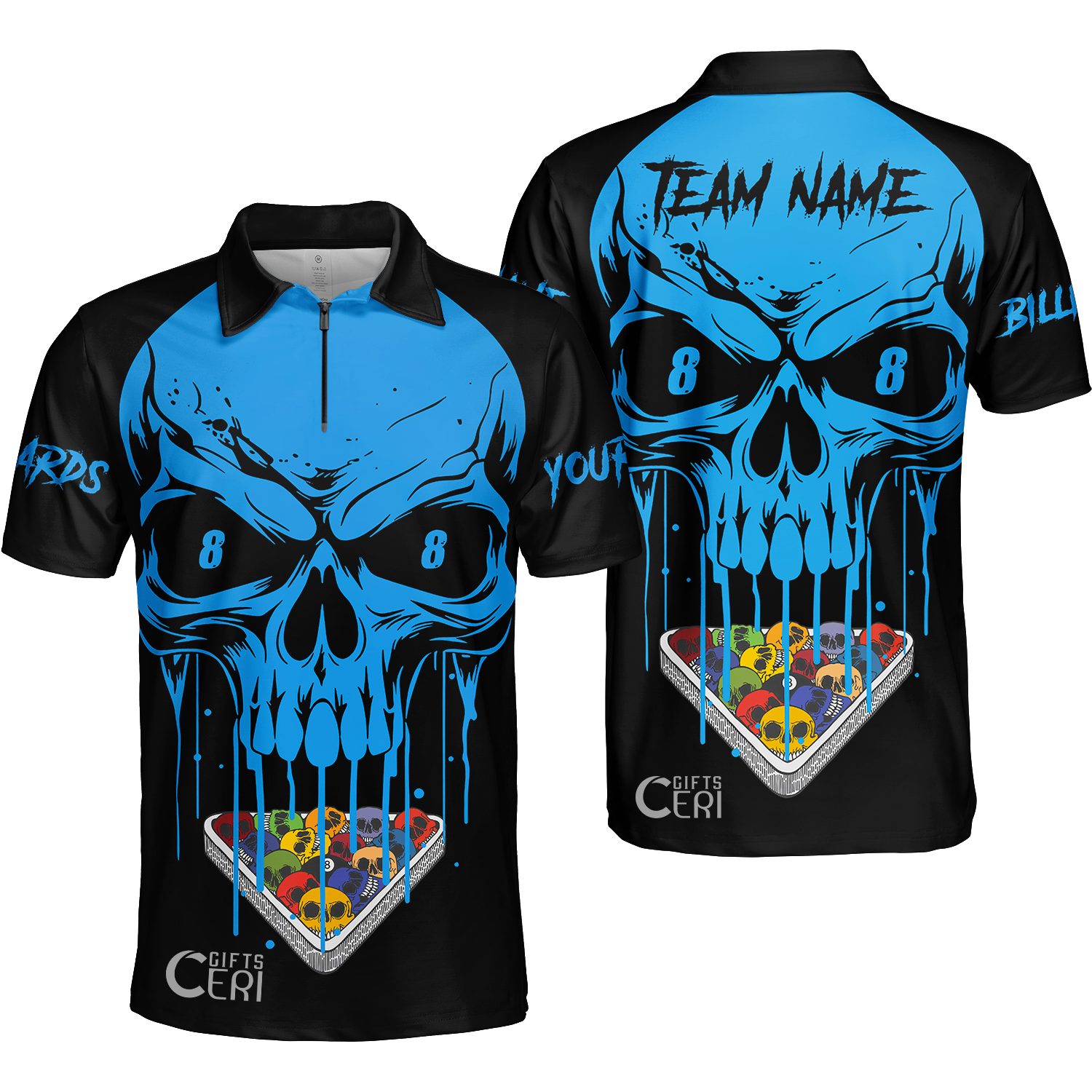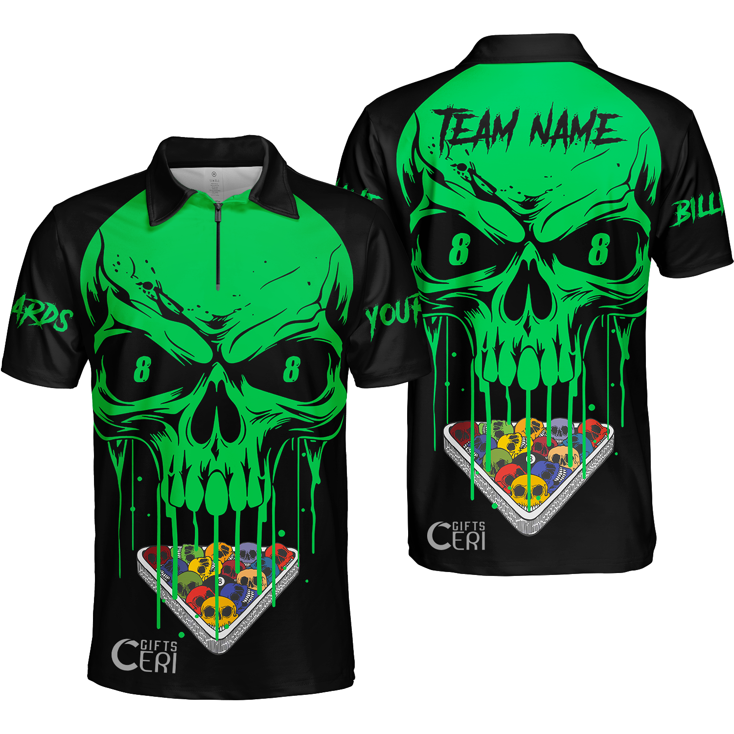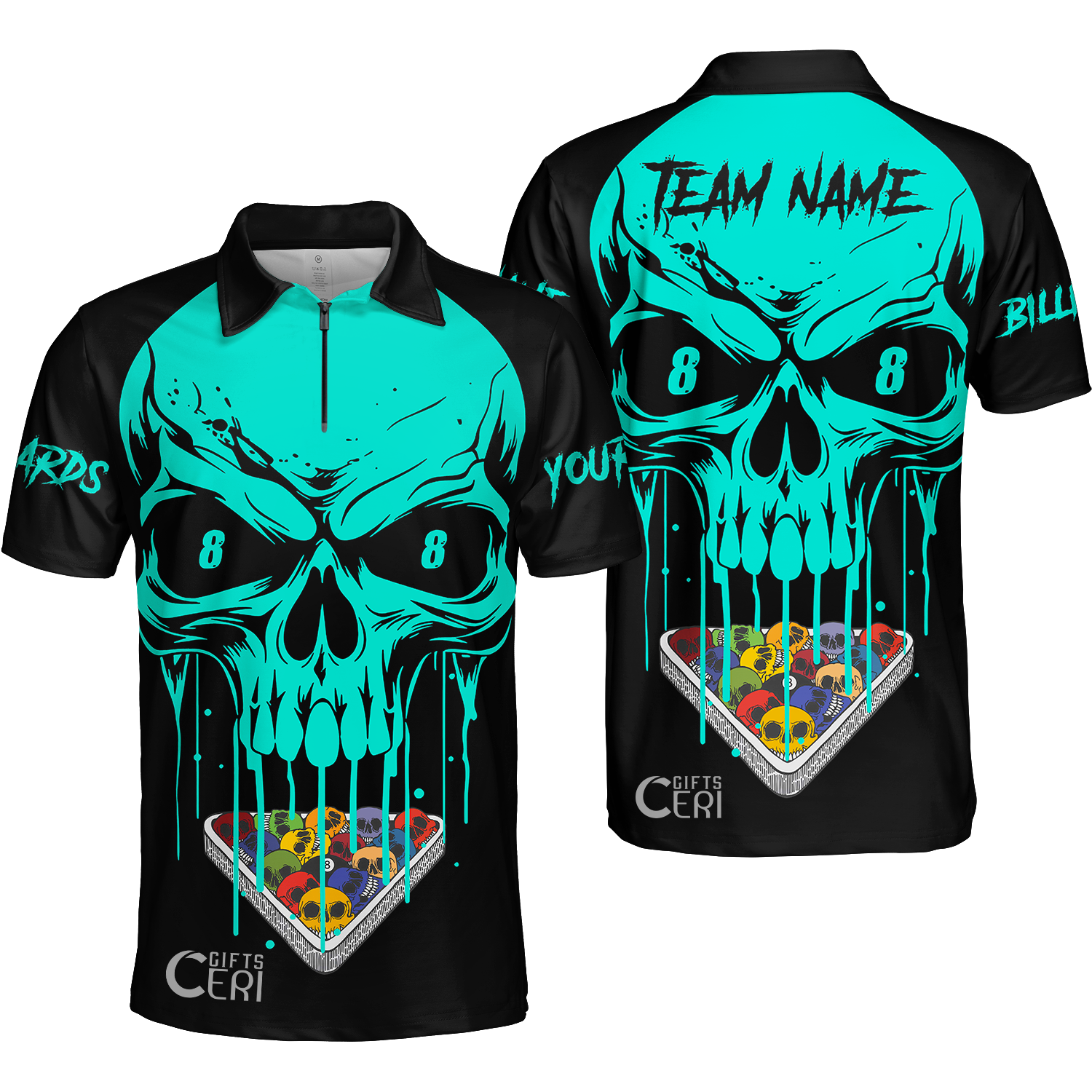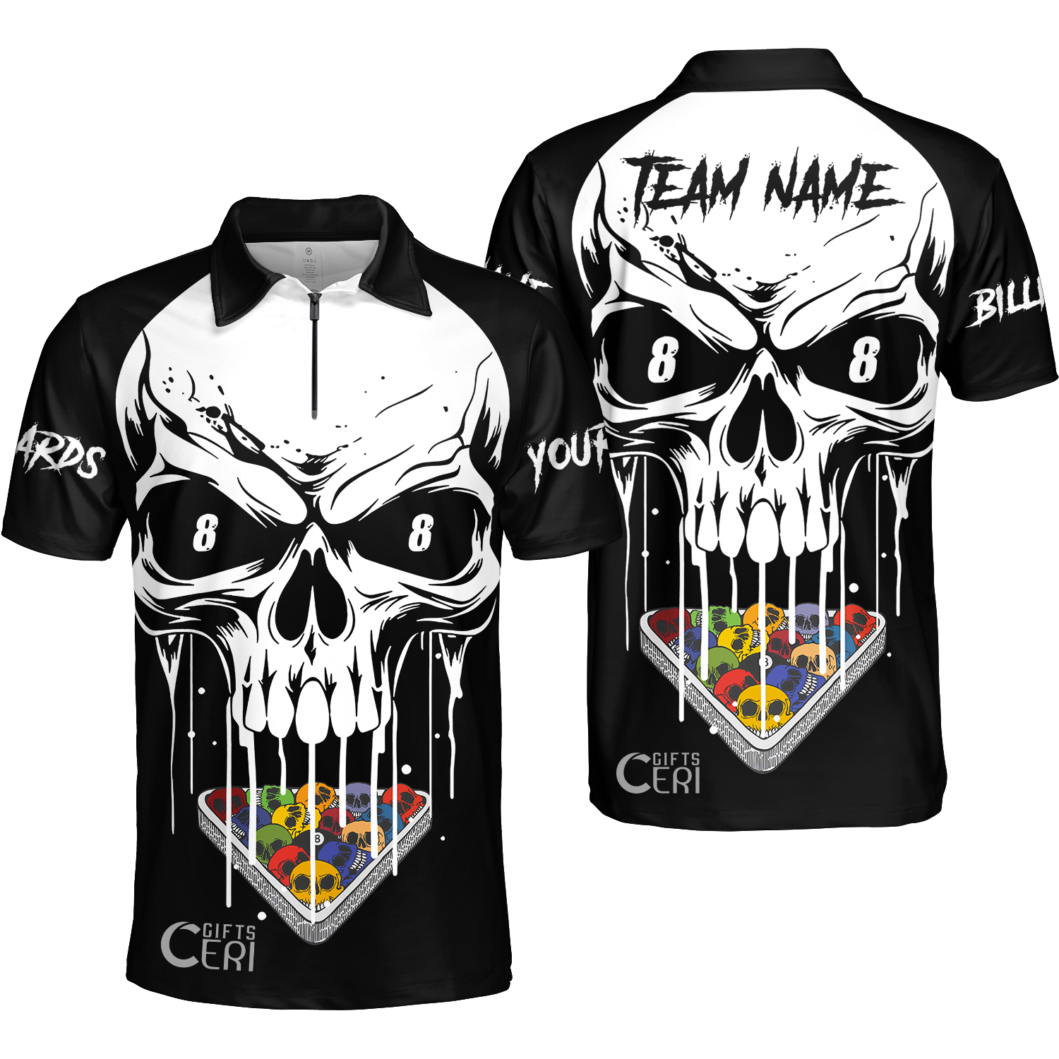 Customized Billiards Quarter-Zip Polo Shirt, Personalized Skull 8 Ball Jersey Gift For Billiard Players