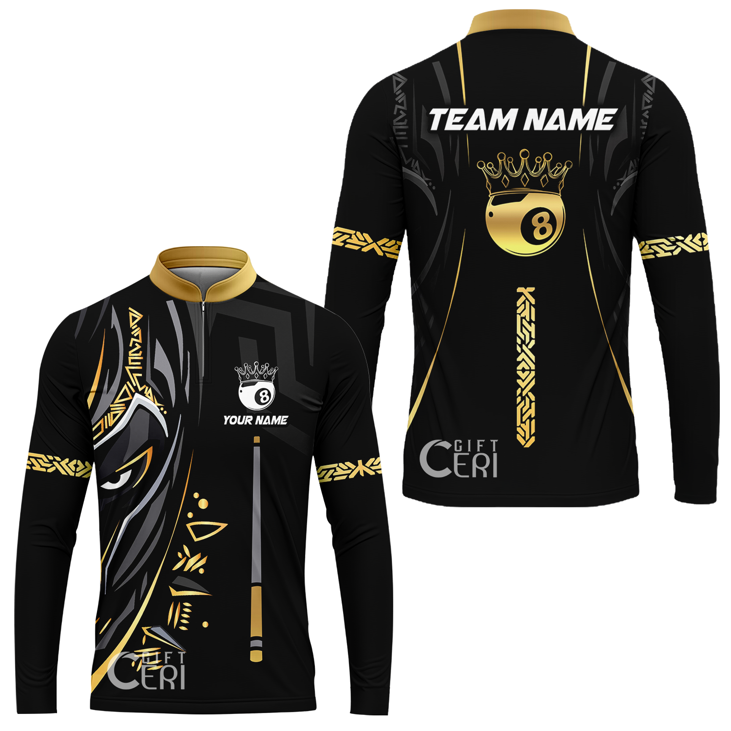 Customized Billiards Stand Collar Quarter-Zip Long Sleeve Jersey, Black Panther With Snooker Cue 8 Ball Pool Jersey