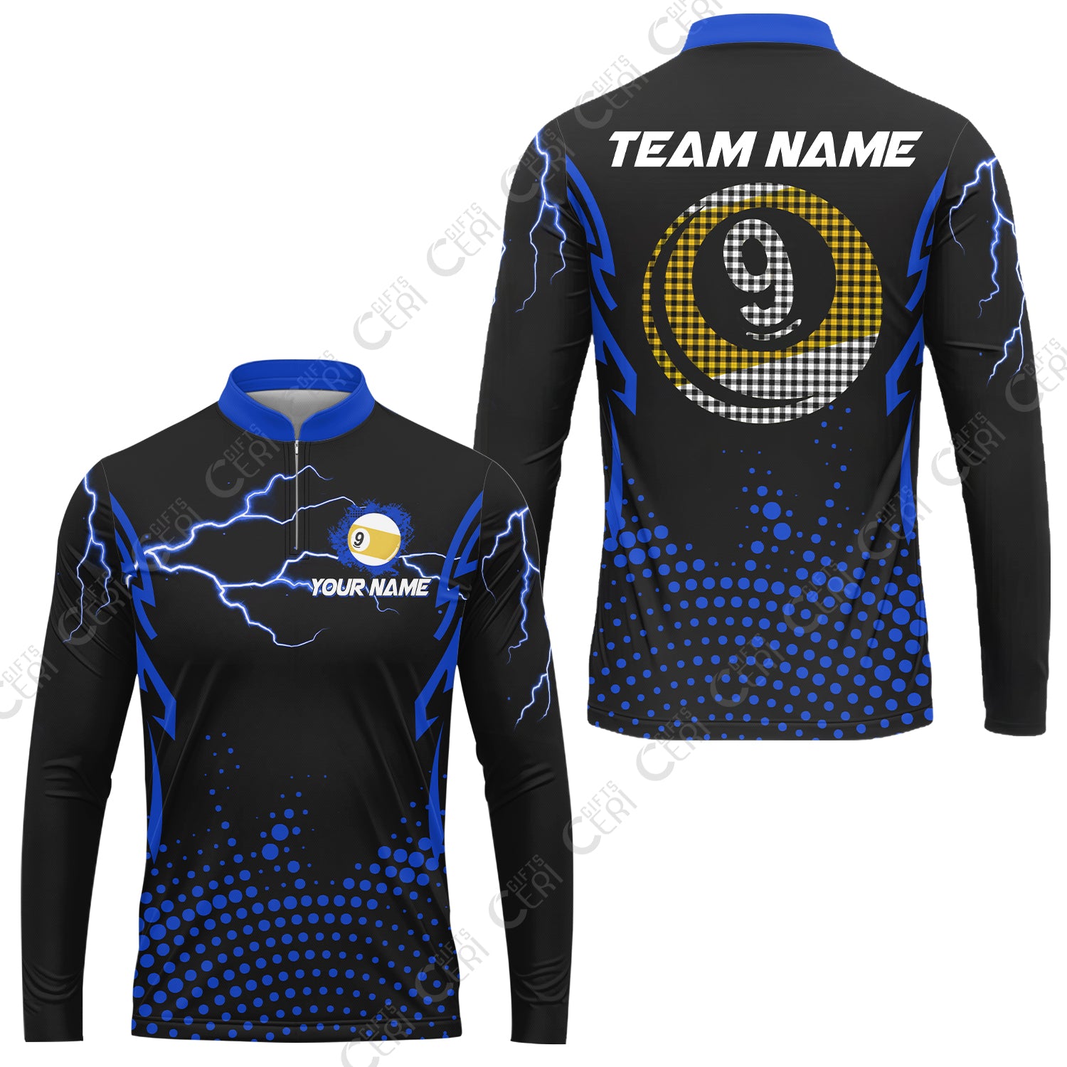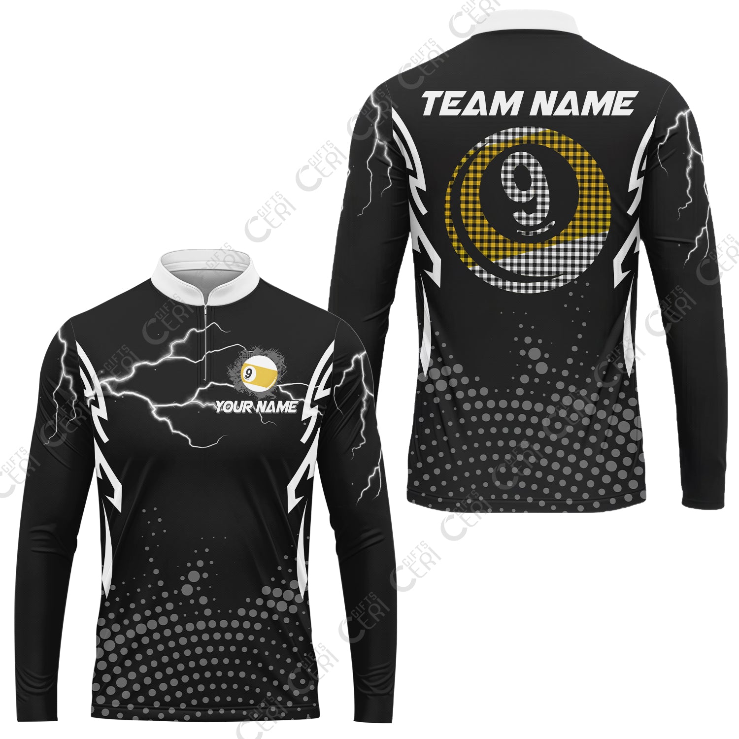Customized Billiards Stand Collar Quarter-Zip Long Sleeve Jersey, Lightning Graphics With Dots 9 Ball Pool Jersey