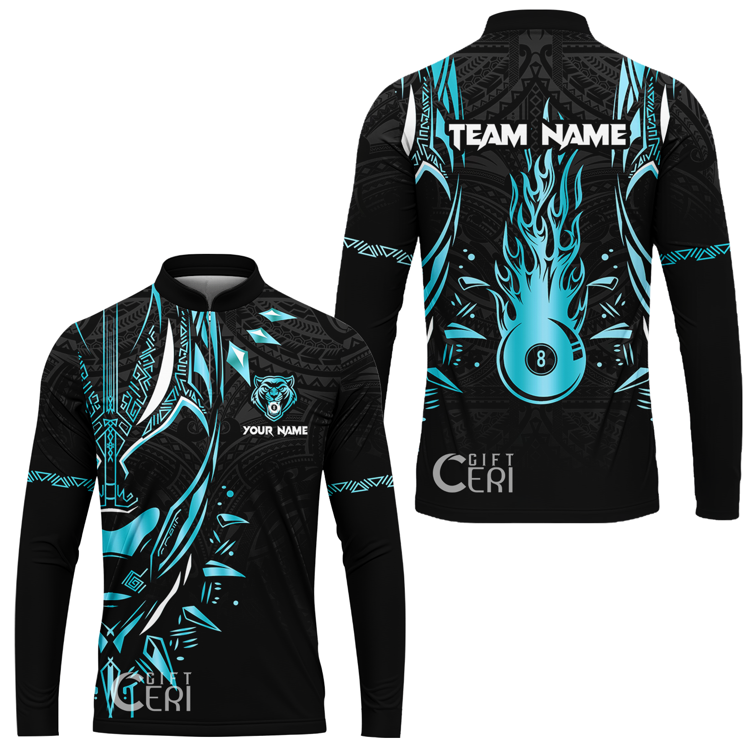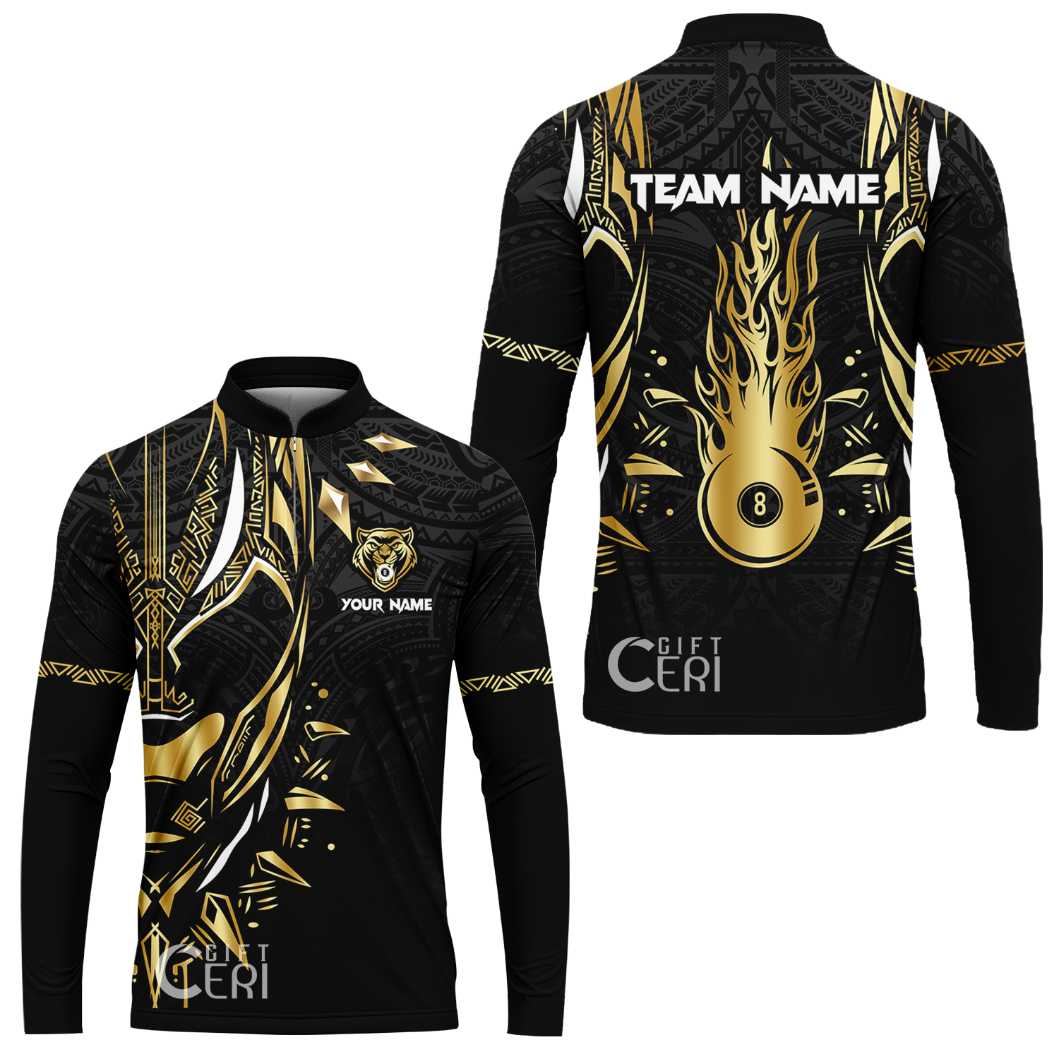 Customized Billiards Stand Collar Quarter-Zip Long Sleeve Jersey, Panther Forever Flaming 8 Ball Personalized Jersey