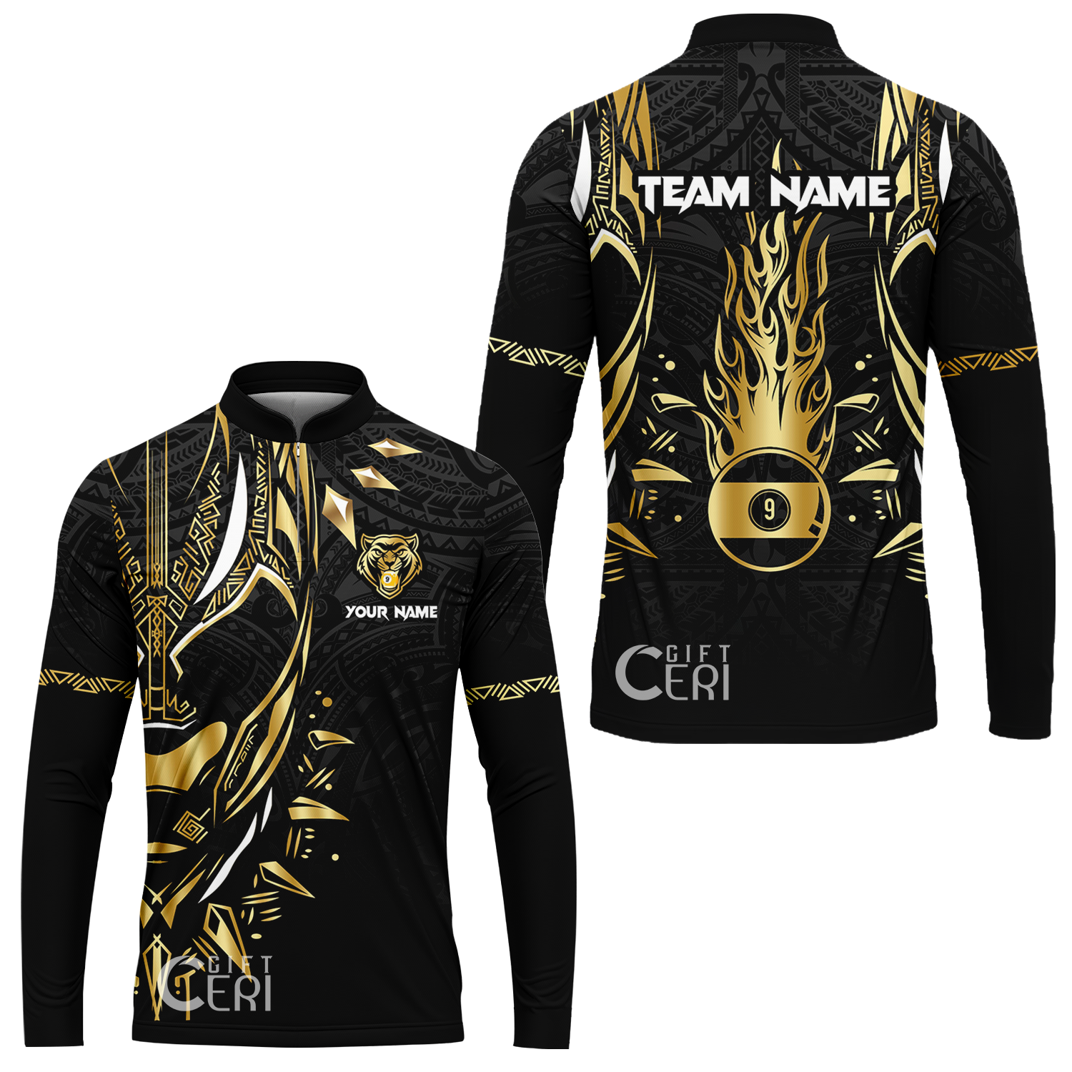 Customized Billiards Stand Collar Quarter-Zip Long Sleeve Jersey, Panther Forever Flaming 9 Ball Personalized Jersey