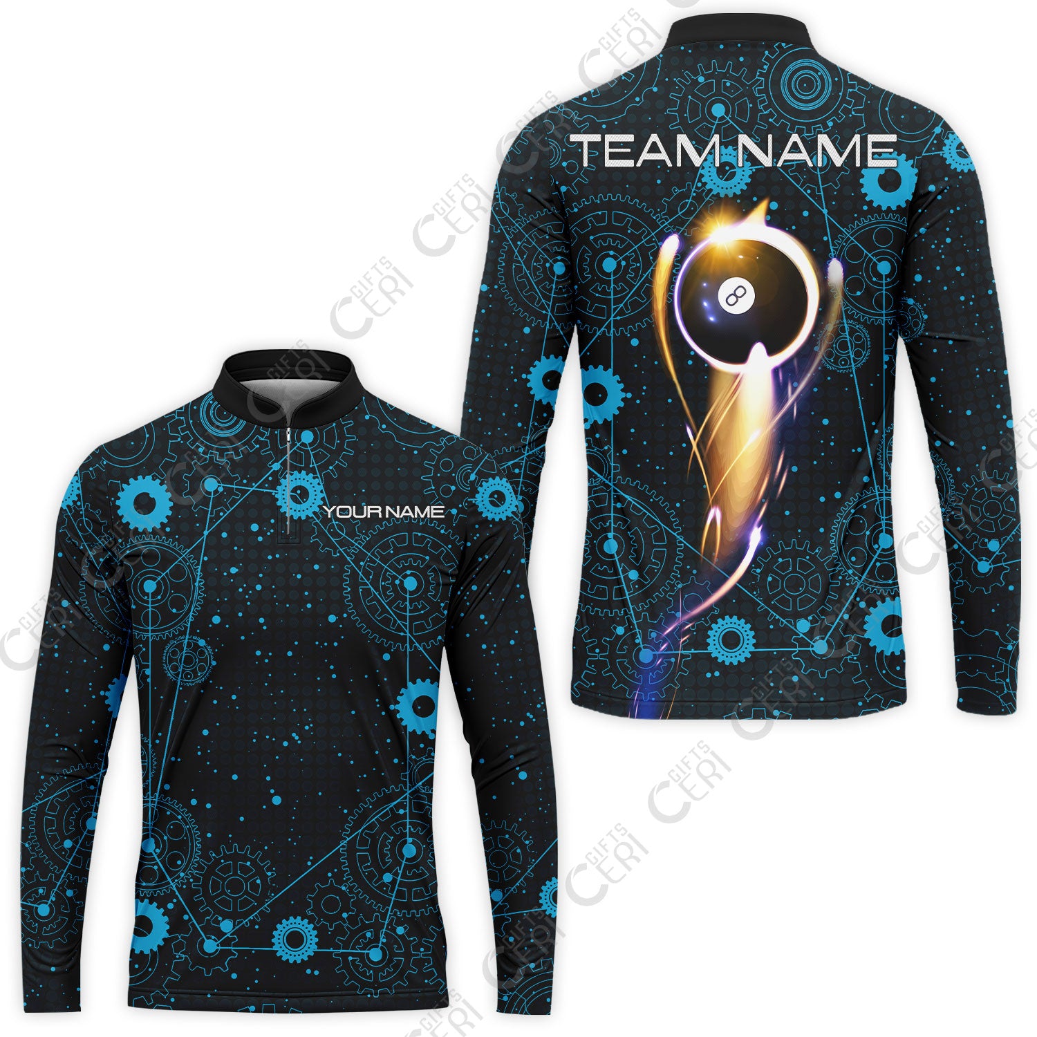 Customized Billiards Stand Collar Quarter-Zip Long Sleeve Jersey, Personalized 8 Ball Lighting Gear Pattern Jersey