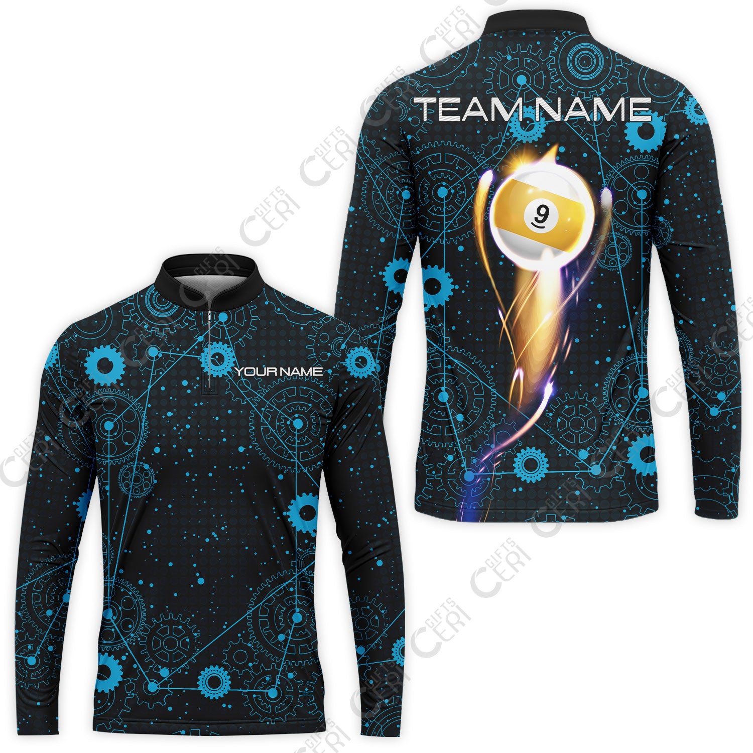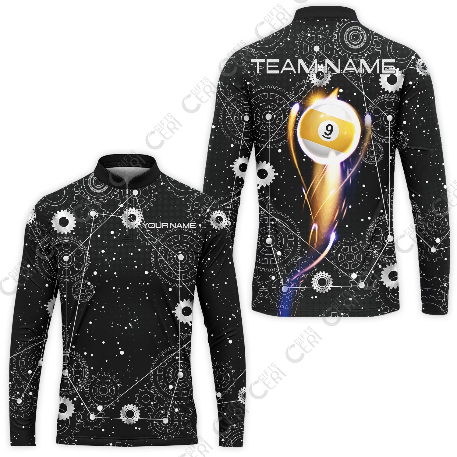 Customized Billiards Stand Collar Quarter-Zip Long Sleeve Jersey, Personalized 9 Ball Lighting Gear Pattern Jersey