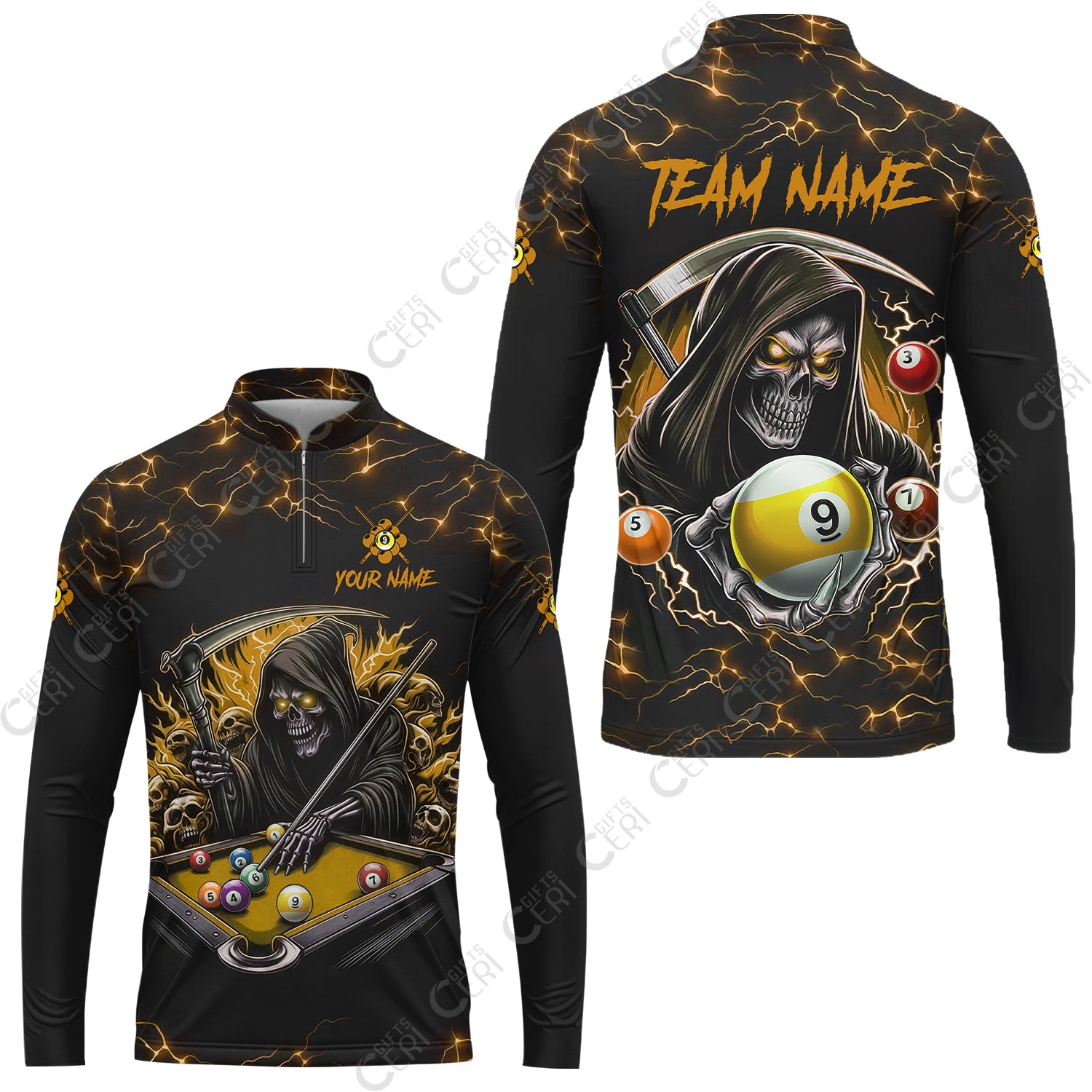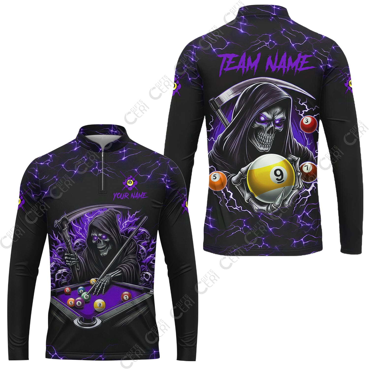 Customized Billiards Stand Collar Quarter-Zip Long Sleeve Jersey, Personalized Billiard Death Skeleton 9 Ball Jersey