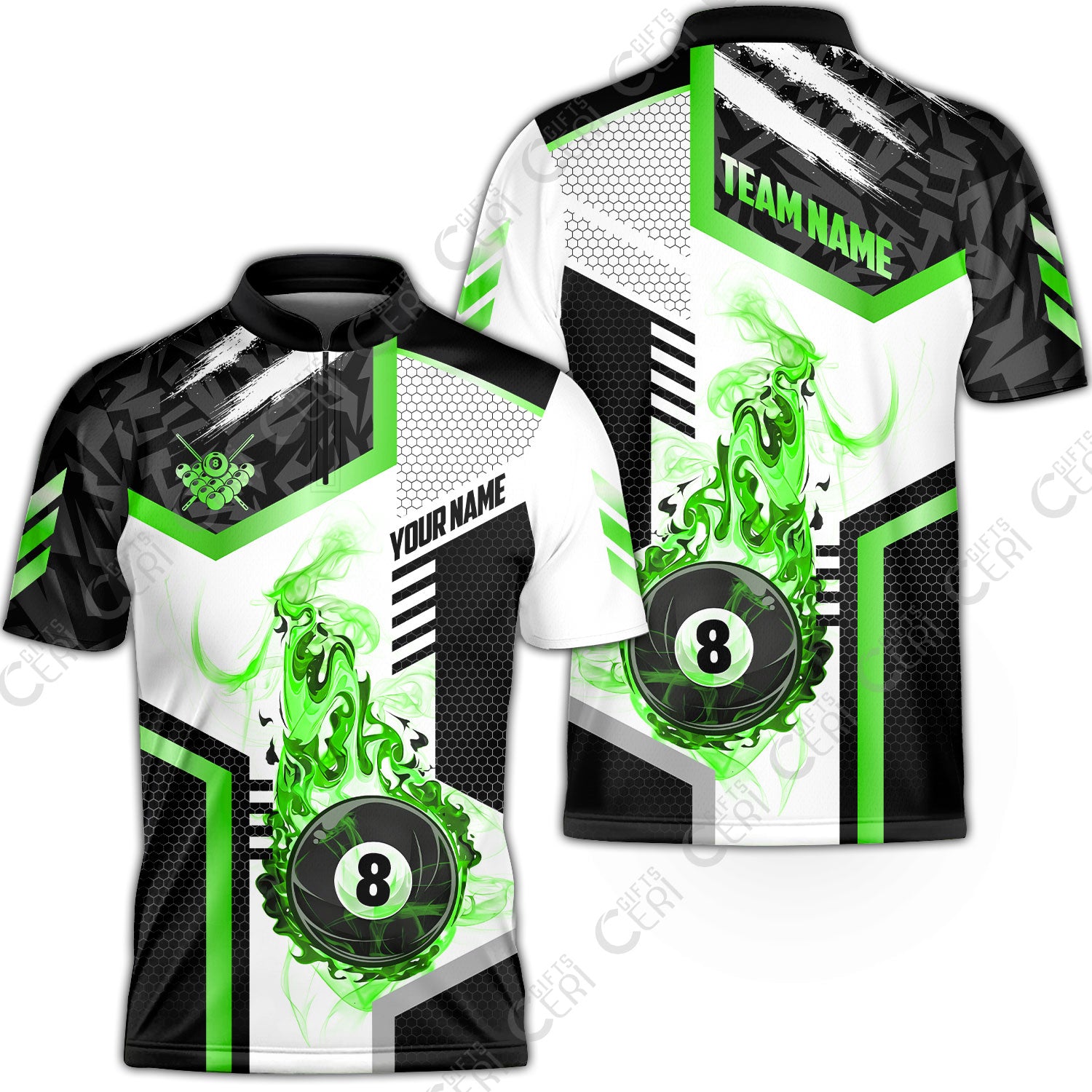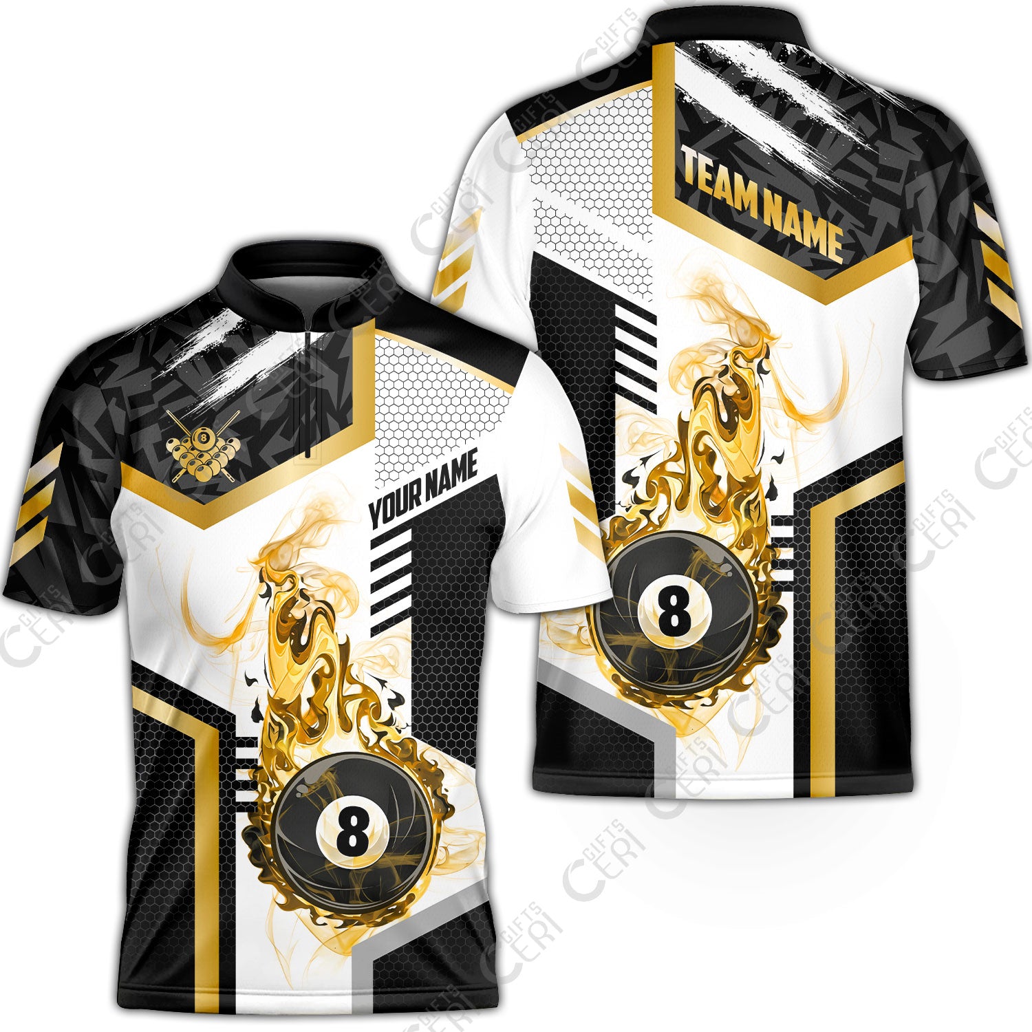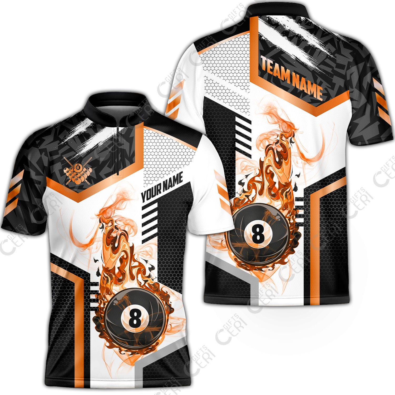 Customized Billiards Stand Collar Quarter-Zip Short Sleeve Jersey, Flaming 8-Ball Graphic, 8 Ball Pool Jersey